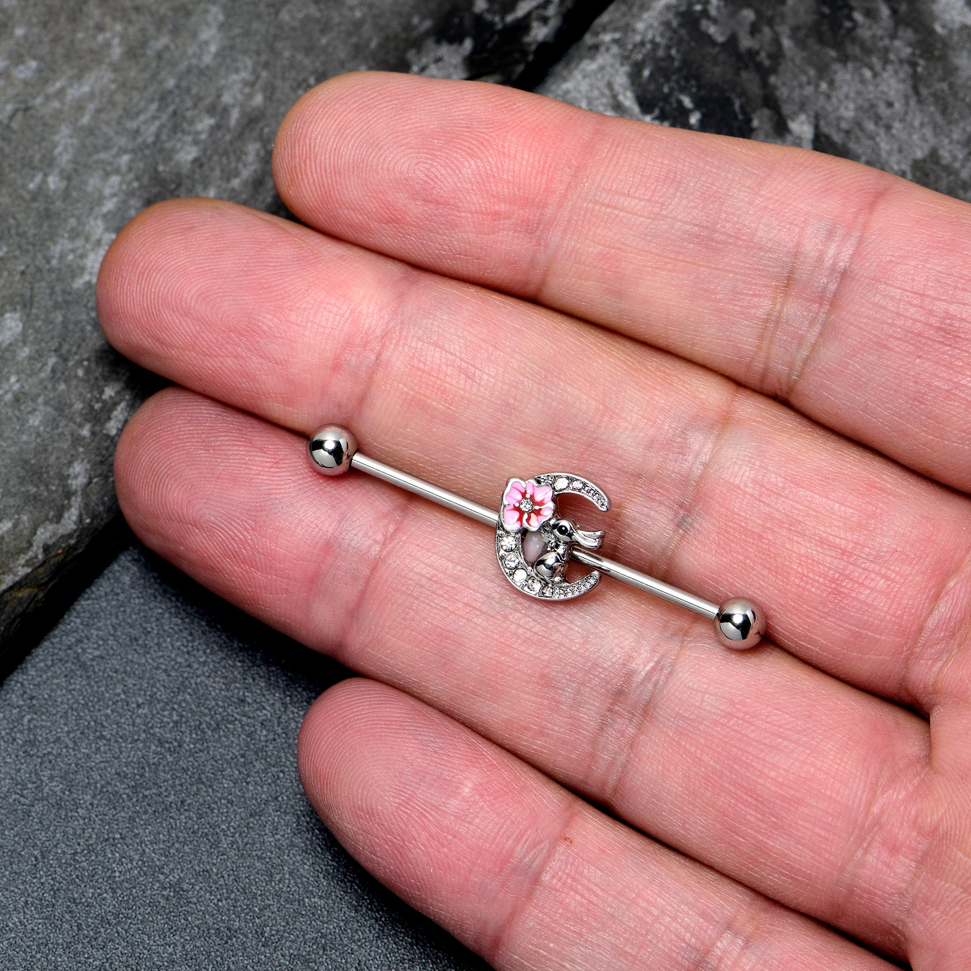 14 Gauge Clear Gem Rabbit On Moon Flower Pink Industrial Barbell 38mm