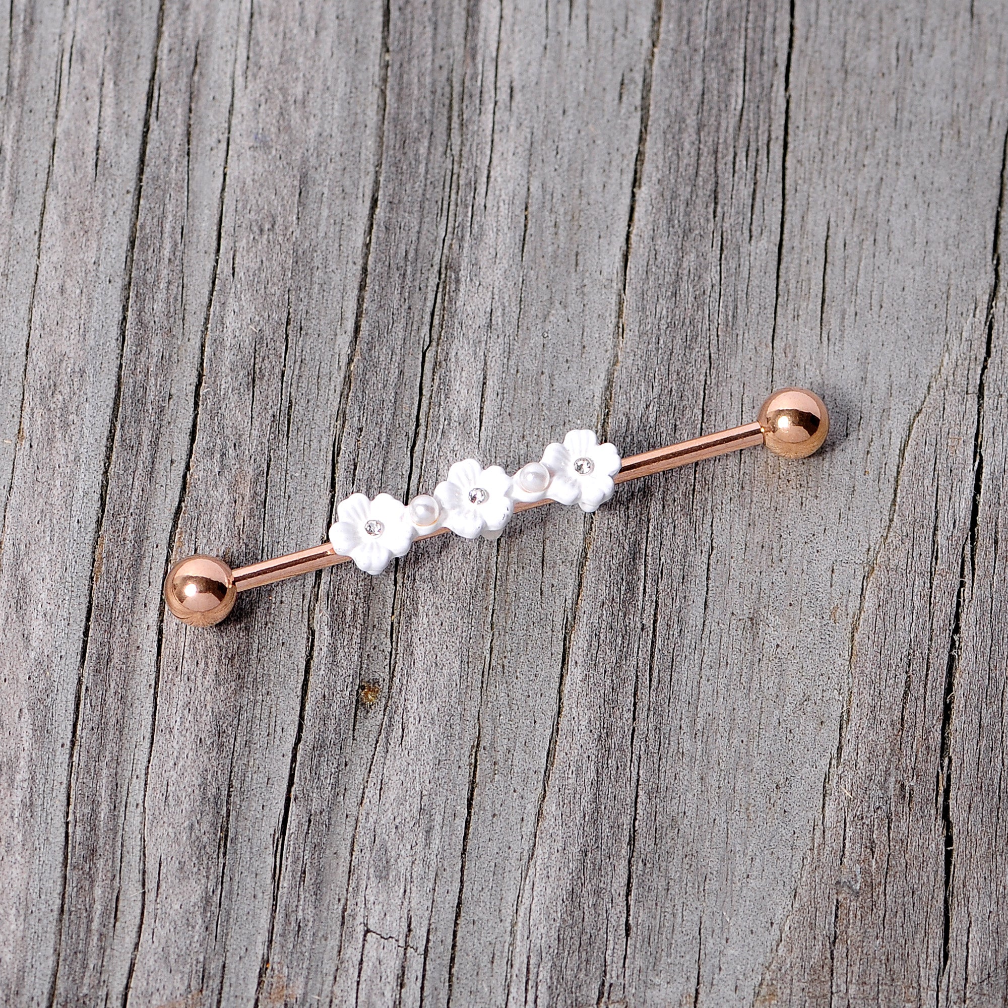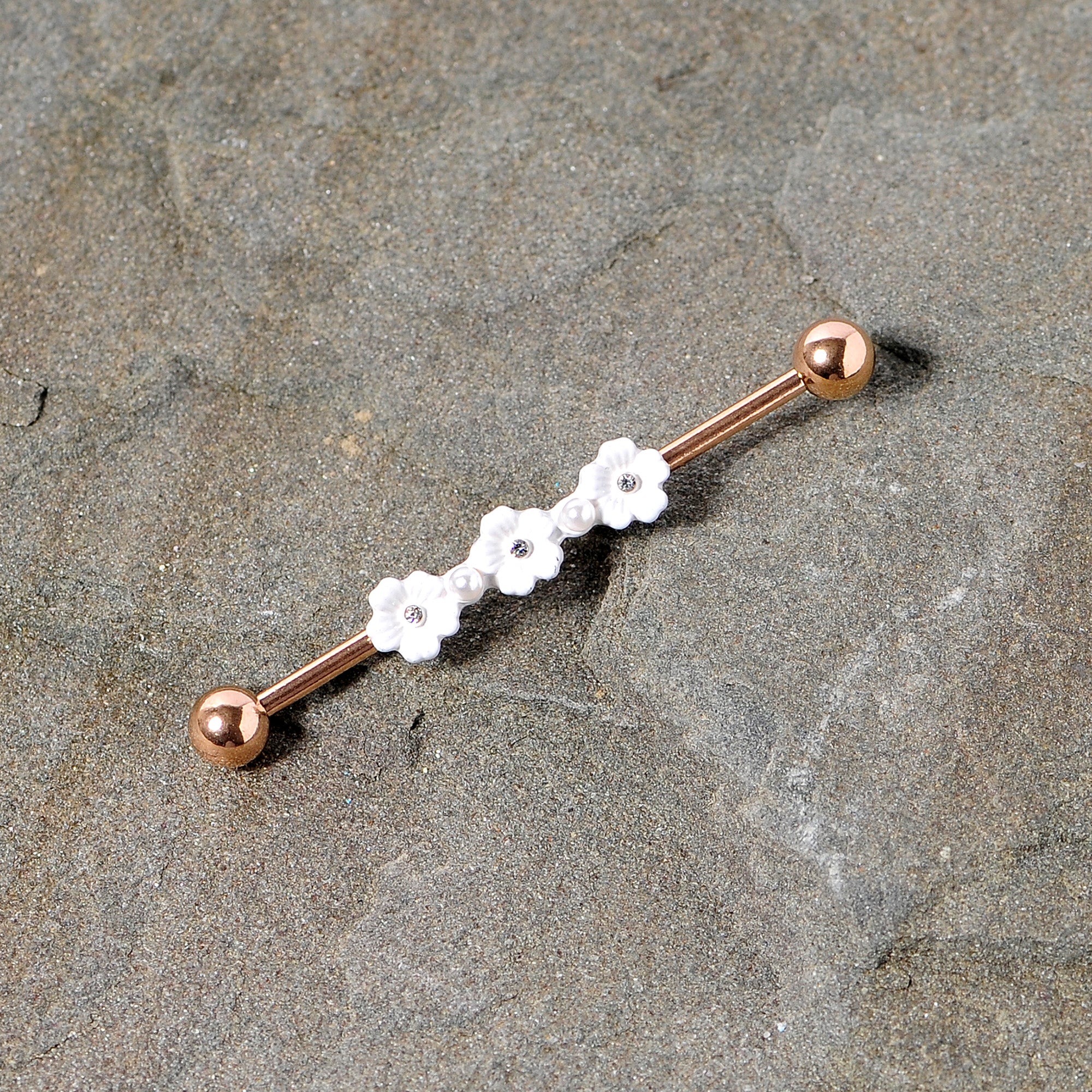 If you're looking for something fun and floral to shake off weary winter then you will love this 14 gauge industrial jewelry with tons of spring style! Made with a 1 1/2" rose gold tone plated over 316L surgical grade stainless steel straight barbell, this industrial earring features a moveable white flower charm set with white orbs and clear gems that will always look as fresh as a spring morning!