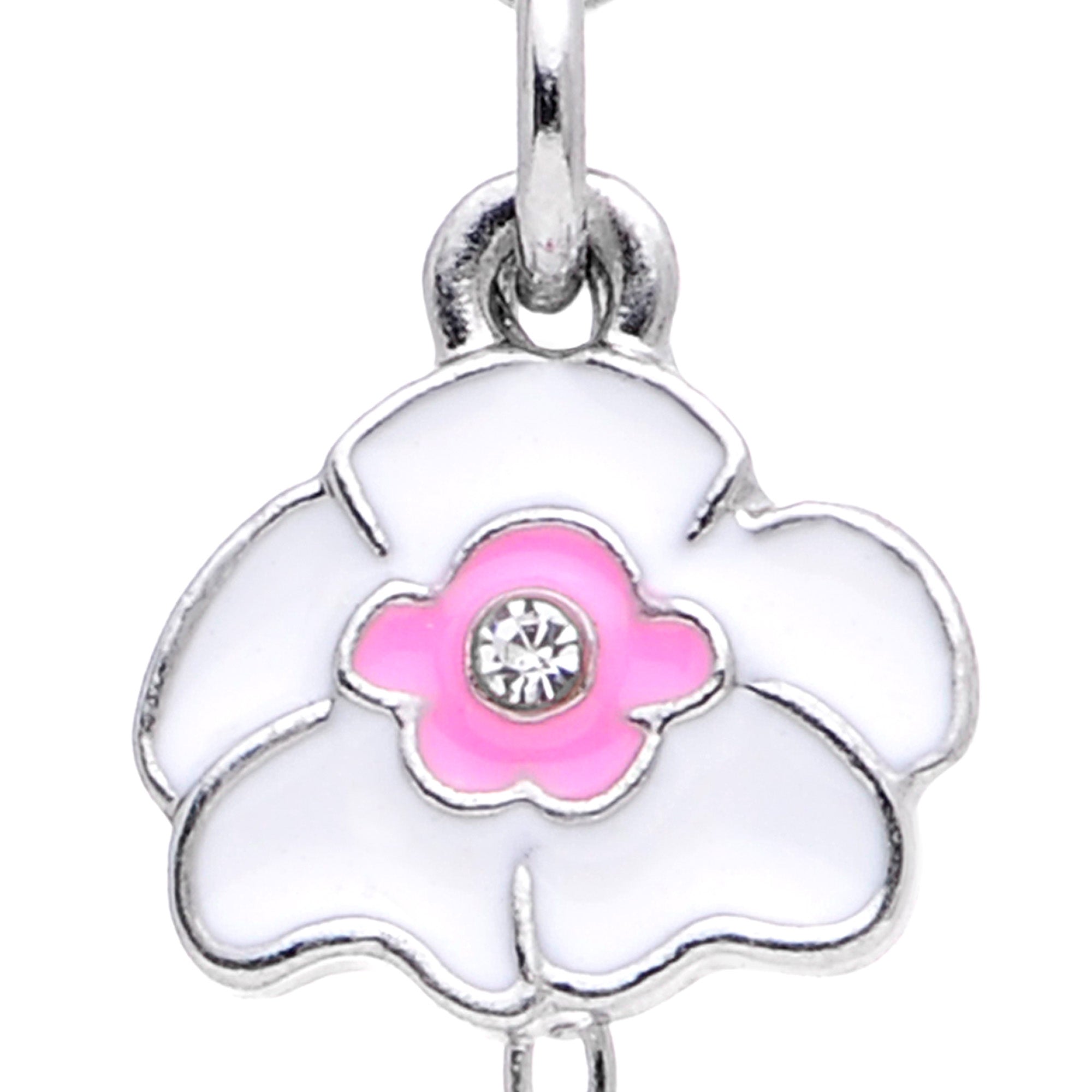Flowers like to bloom in nice green spaces....even when they're dangling from your ear! This 14 gauge helix barbell is made with a 1 1/2" durable 316L surgical grade stainless steel straight barbell with 5mm ball ends. Dangling from one of the ball ends is a white flower charm with a pink center and a small clear gem. Also dangling from the ball end is a small length of chain supporting two cat's-eye-shaped gems in a deep rich green. This blossoming barbell industrial is bound to look beauteous in your industrial piercing!
