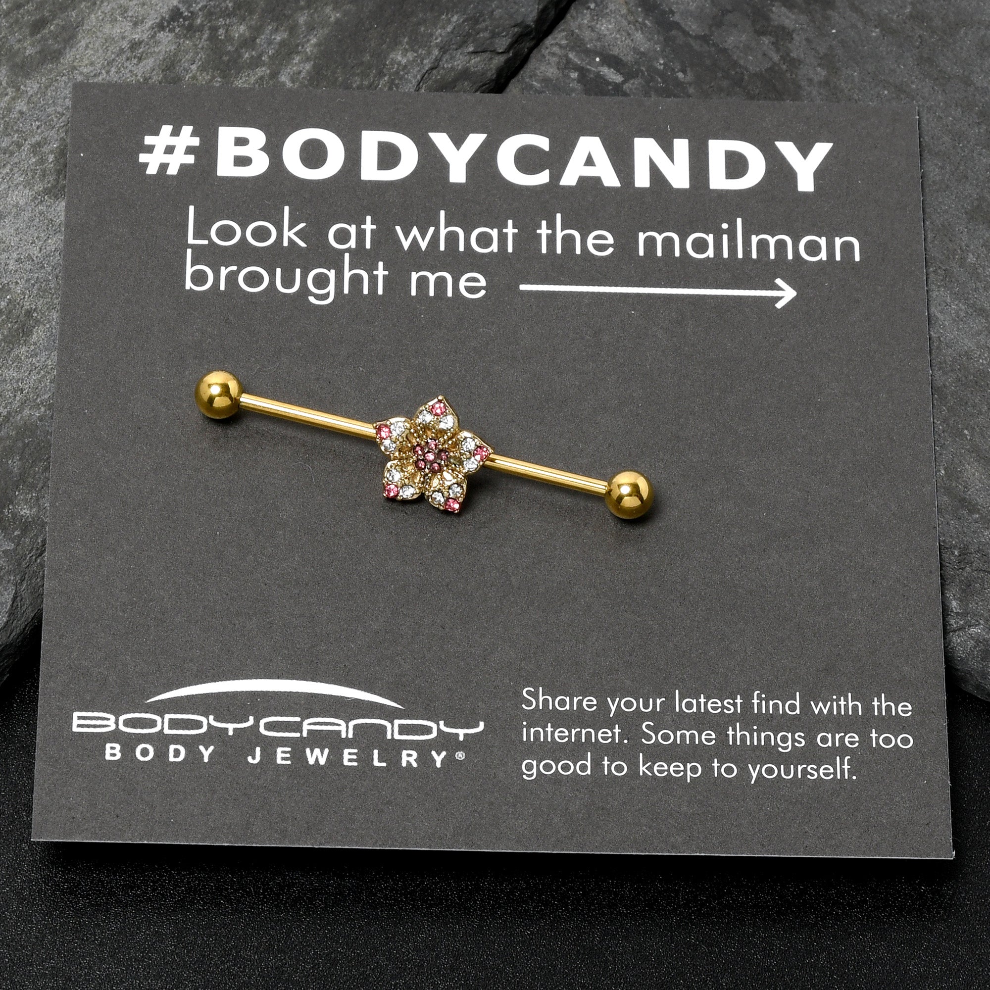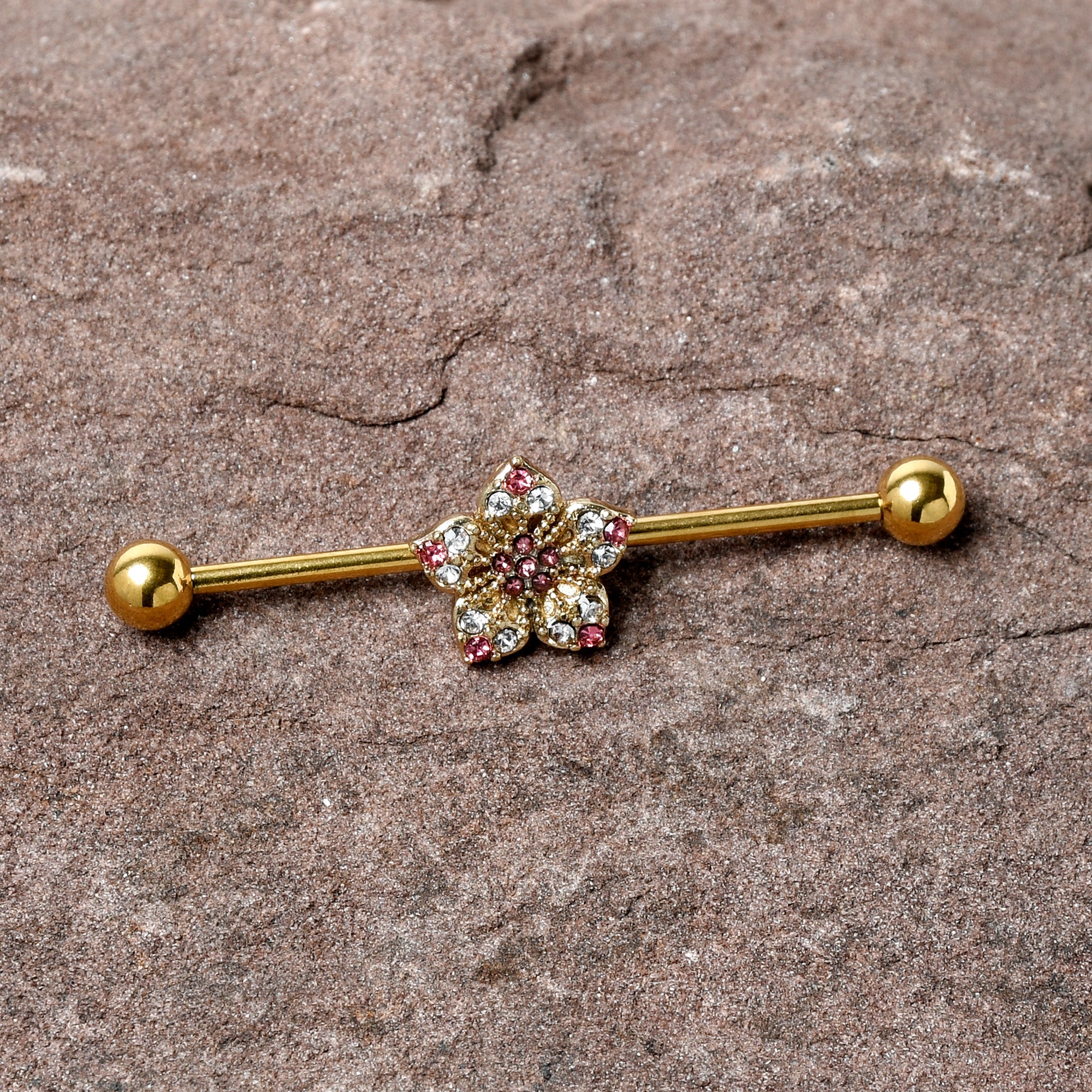 14 Gauge Clear Pink Gem Gold Tone Texture Star Industrial Barbell 38mm