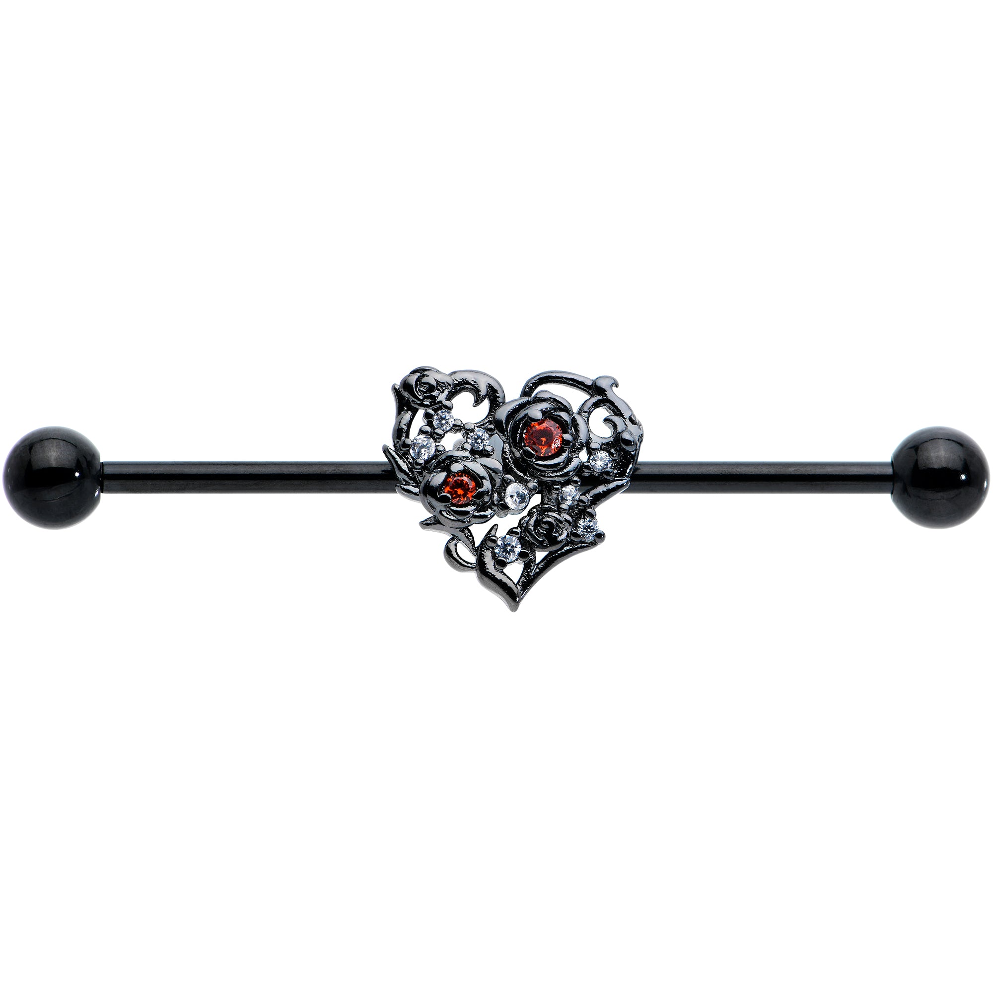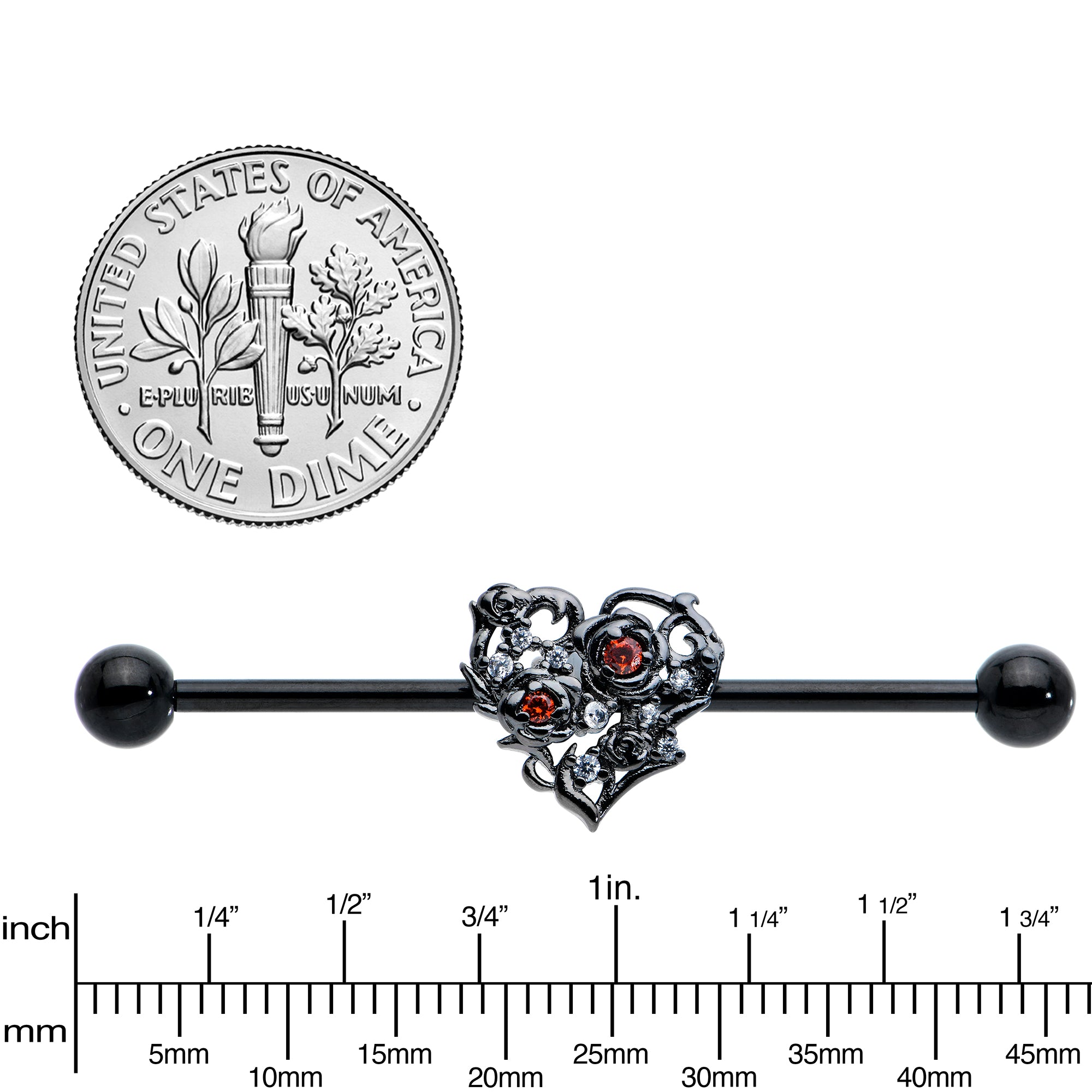 14G Clear Red CZ Gem Black Heart Floral Industrial Barbell 38mm