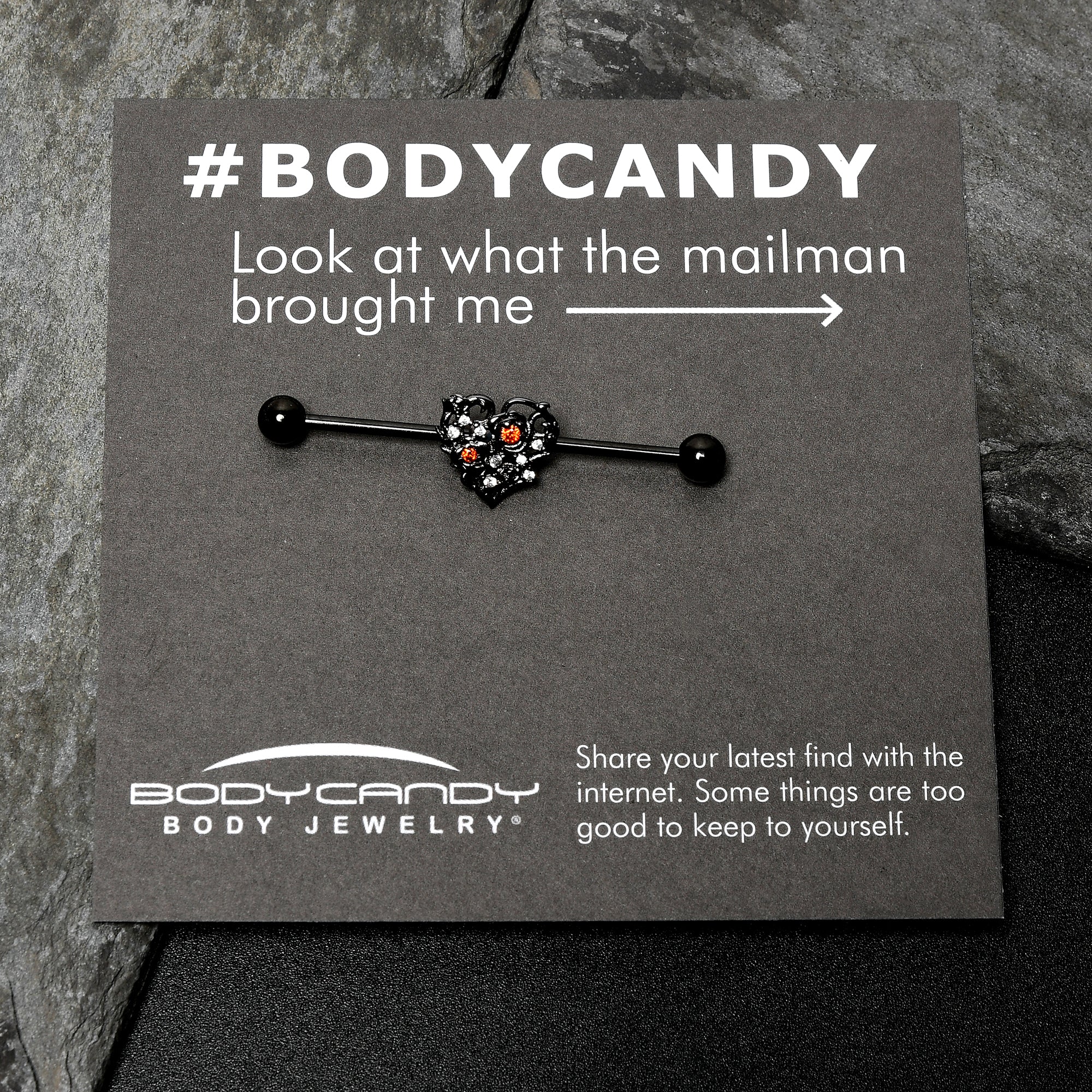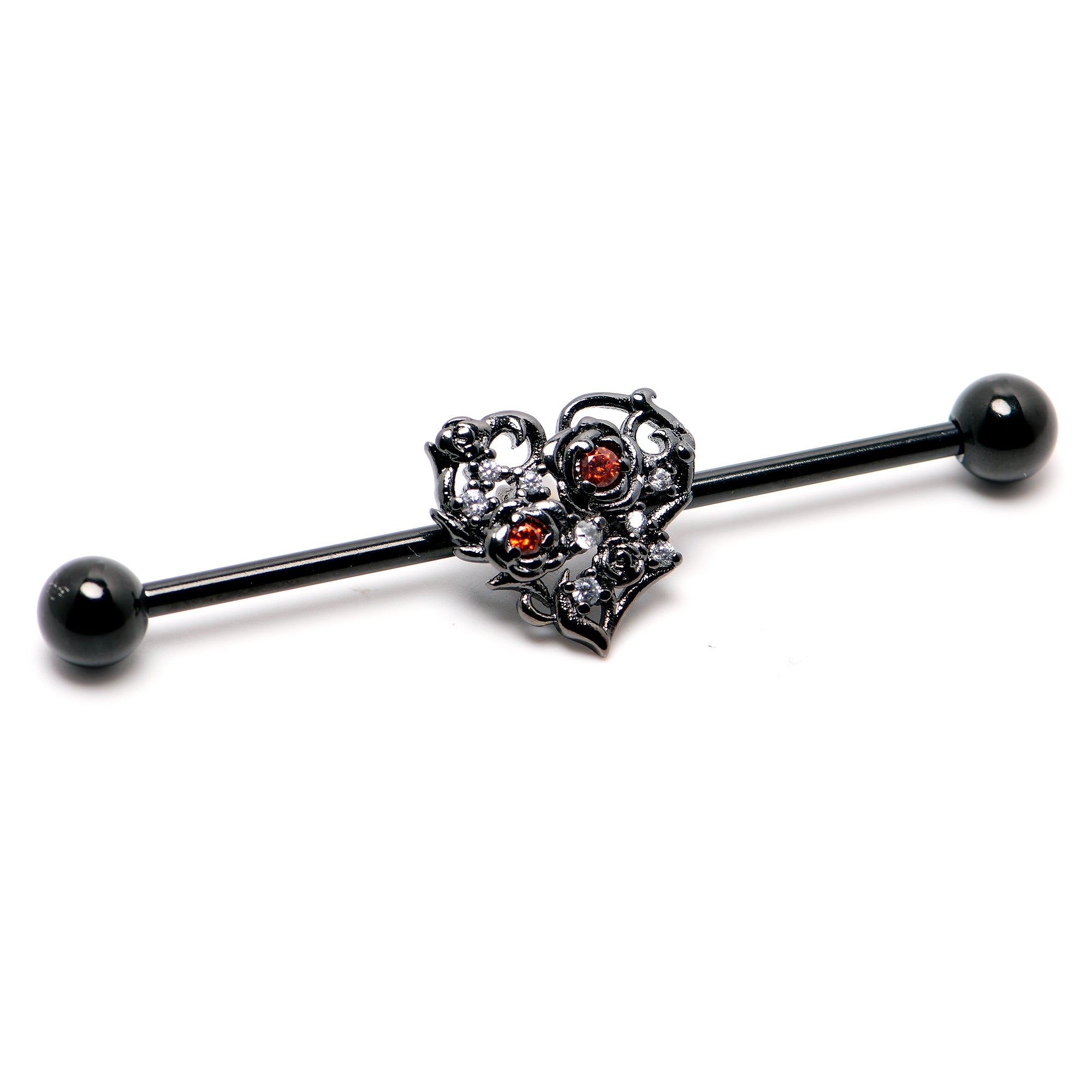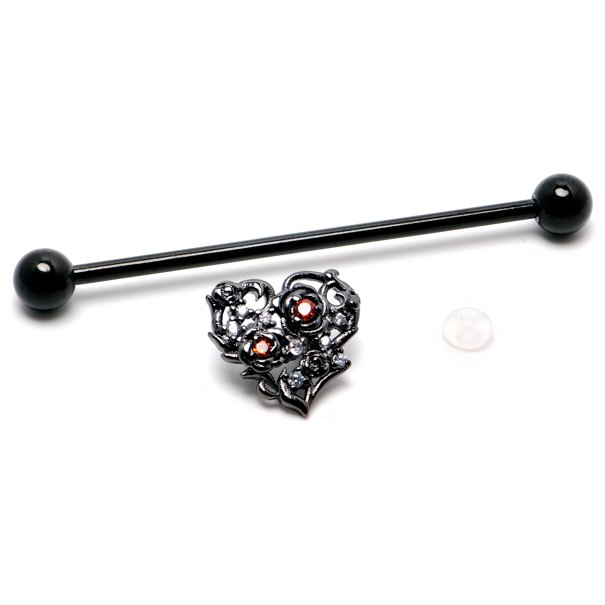 14 Gauge Clear Red CZ Gem Black Heart Floral Industrial Barbell 38mm