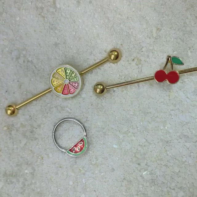 Now that's a tasty-looking pair....of cherries on this 14 gauge helix barbell! It's made with a 1 1/2" gold tone PVD over 316L surgical grade stainless steel straight barbell with 5mm ball ends. It features a pair of red cherries charm. You can even slide the charm up and down the length of the barbell to get just the look you're after. If you're looking for a sweet look for you're industrial piercing, these cherries are bound to be your pick!