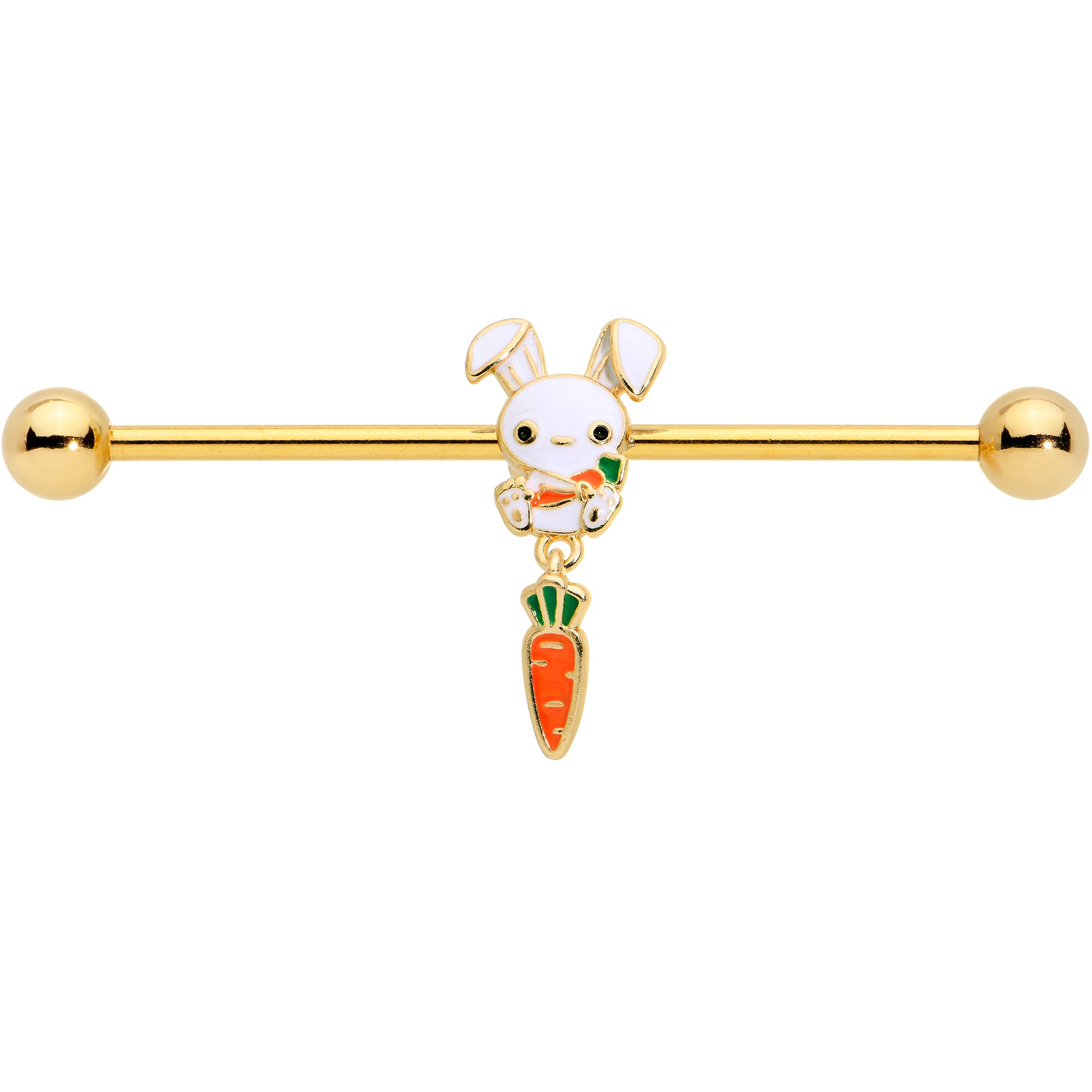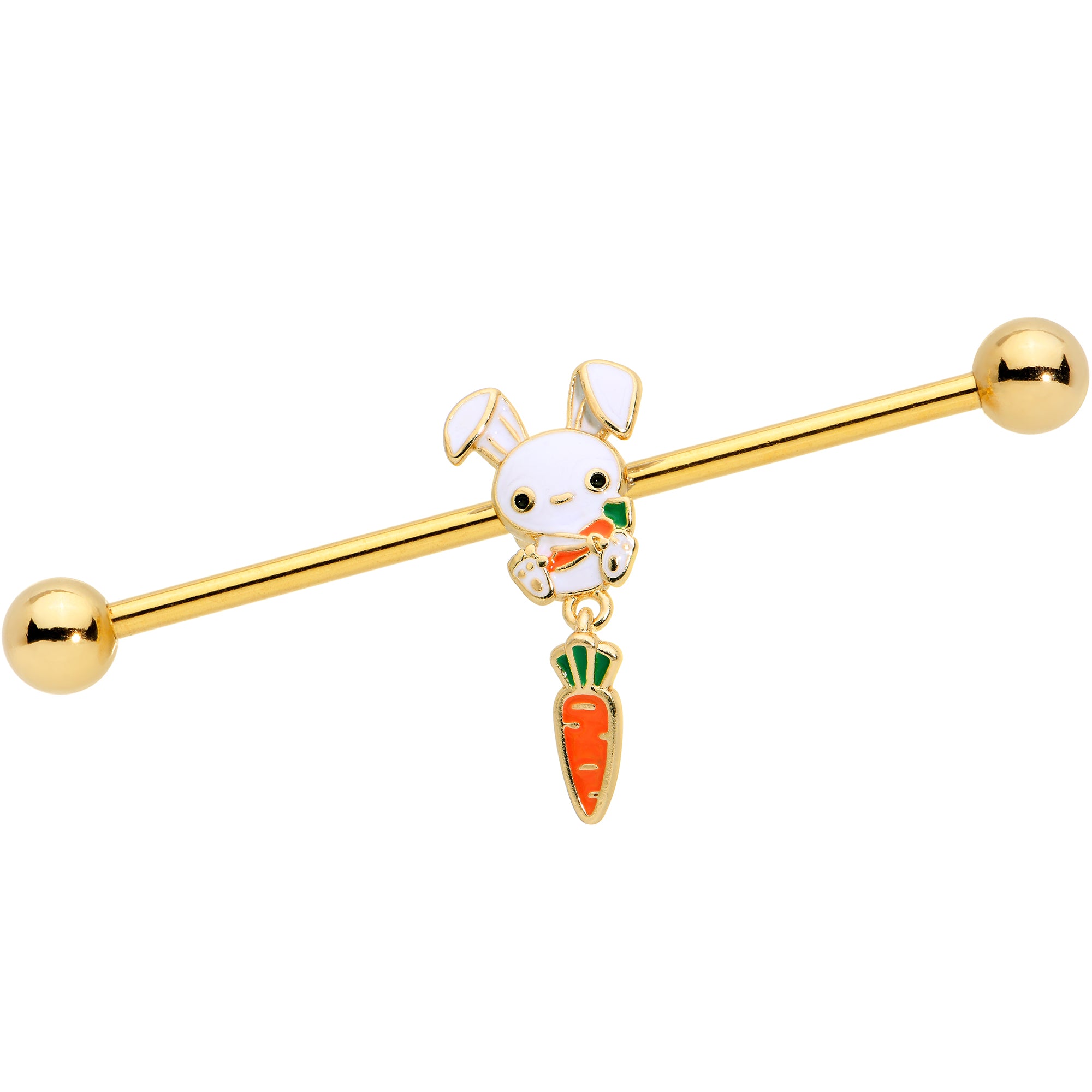The Easter Bunny on this 14 gauge helix barbell is quite the little cutie. It is made with a 1 1/2 inch gold tone PVD over 316L surgical grade stainless steel straight barbell with 5mm ball ends. It features an Easter Bunny charm, with the bunny cradling a carrot. It also features a dangling carrot charm for a cohesive and eye catching look. You can even slide it up and down the length of the barbell for the perfect look. The bunny on this barbell earrings is one you will want hanging around all year long.