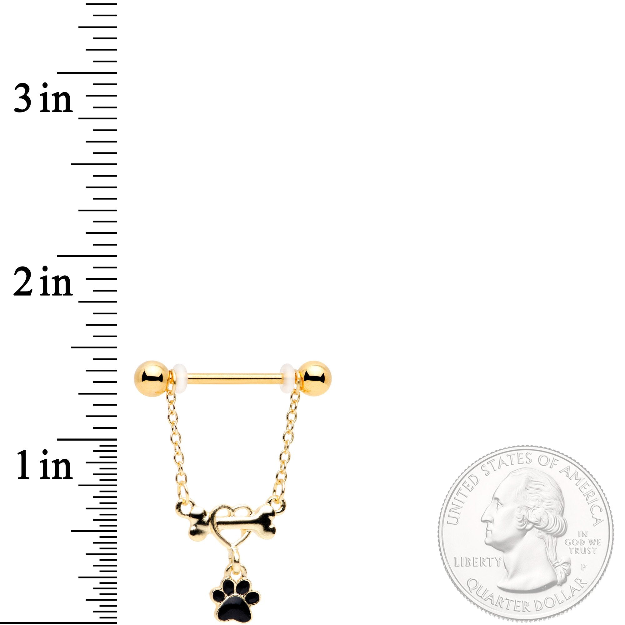 If you can't get enough of your favorite pet then this pair of 14 gauge paw print nipple piercings is perfect for you. Made with 9/16" gold tone plated over 316L surgical grade stainless steel straight barbells, this nipple jewelry features a bone dangle charm on chain dangles with a heart and black paw print detail to show your love for all good dogs everywhere! Sold as a set of two.