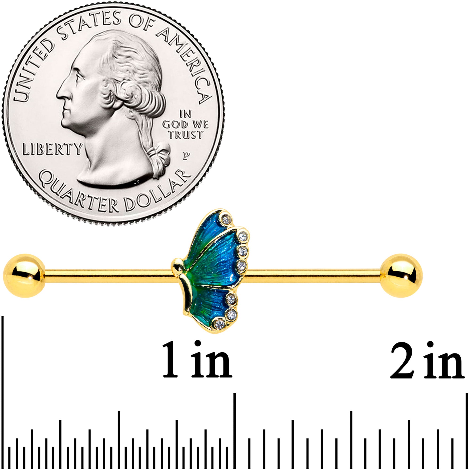 14G Gold Tone Ombre Blue Butterfly Industrial Barbell 38mm
