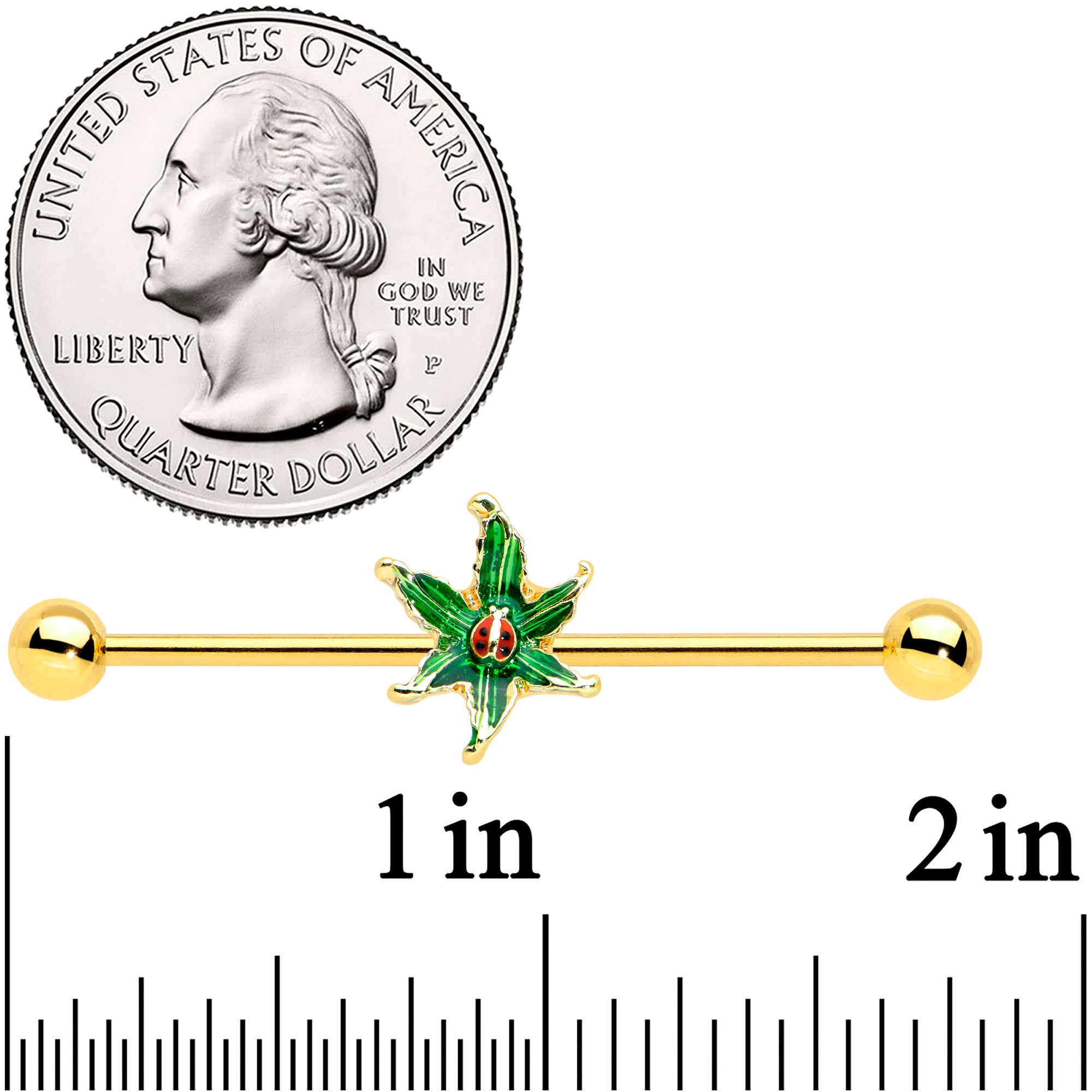 14 Gauge Gold Tone Tiny Ladybug Leaves Industrial Barbell 38mm