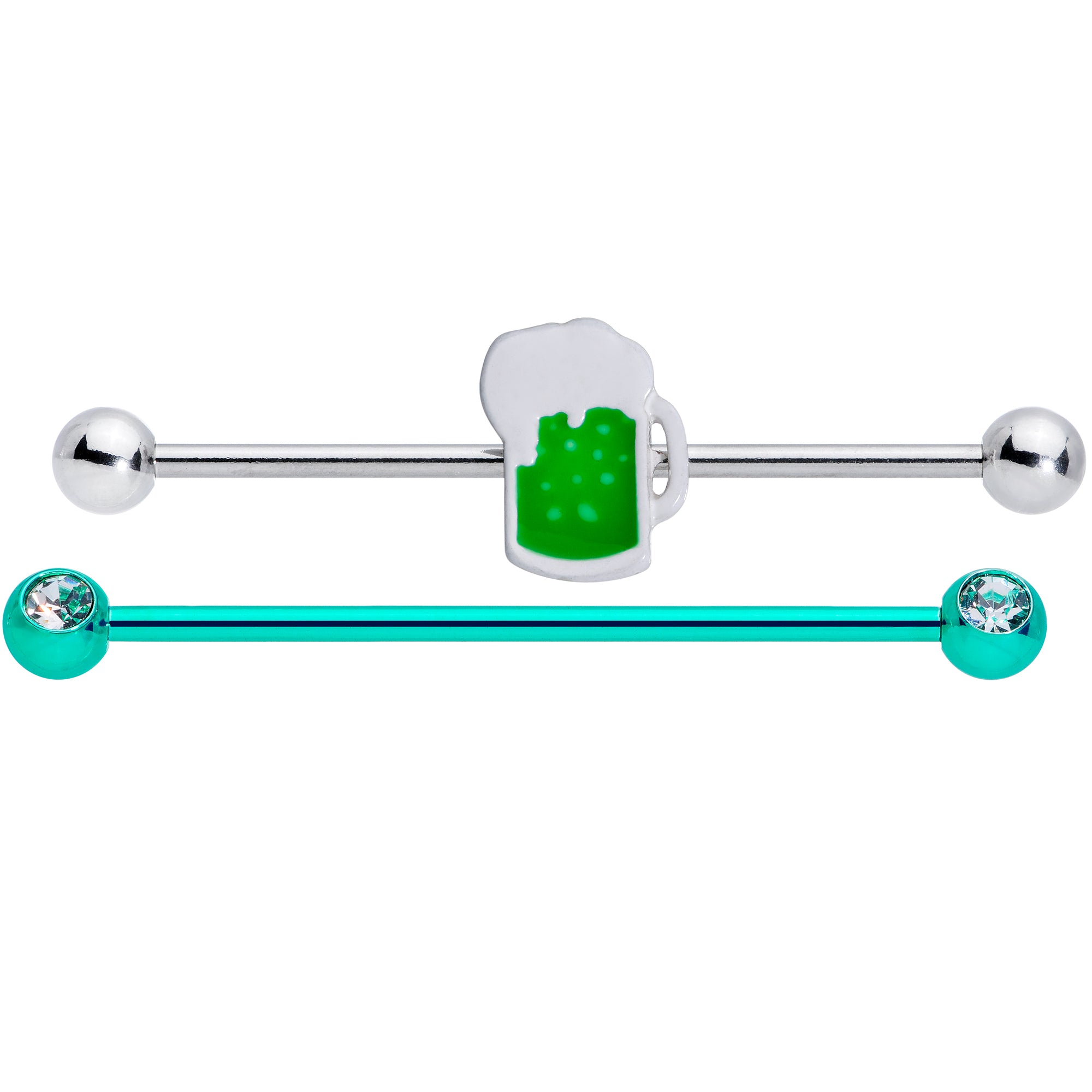 This St Patrick's Day there's no need to belly up to the bar with this set of 14 gauge helix barbells! The first is made with a 1 1/2" green PVD over 316L surgical grade stainless steel straight barbell and features 5mm ball ends which are set with clear gems. The other double helix earring is made with a 1 1/2" durable 316L surgical grade stainless steel straight barbell with 5mm ball ends and features a green mug of beer charm. The charm also features white color embellishment and can be slid up and down the barbell to get just the look you want. This St Patrick's Day, wear a beer in your ear or just go green with this set of barbell earrings! Sold as a set of two.