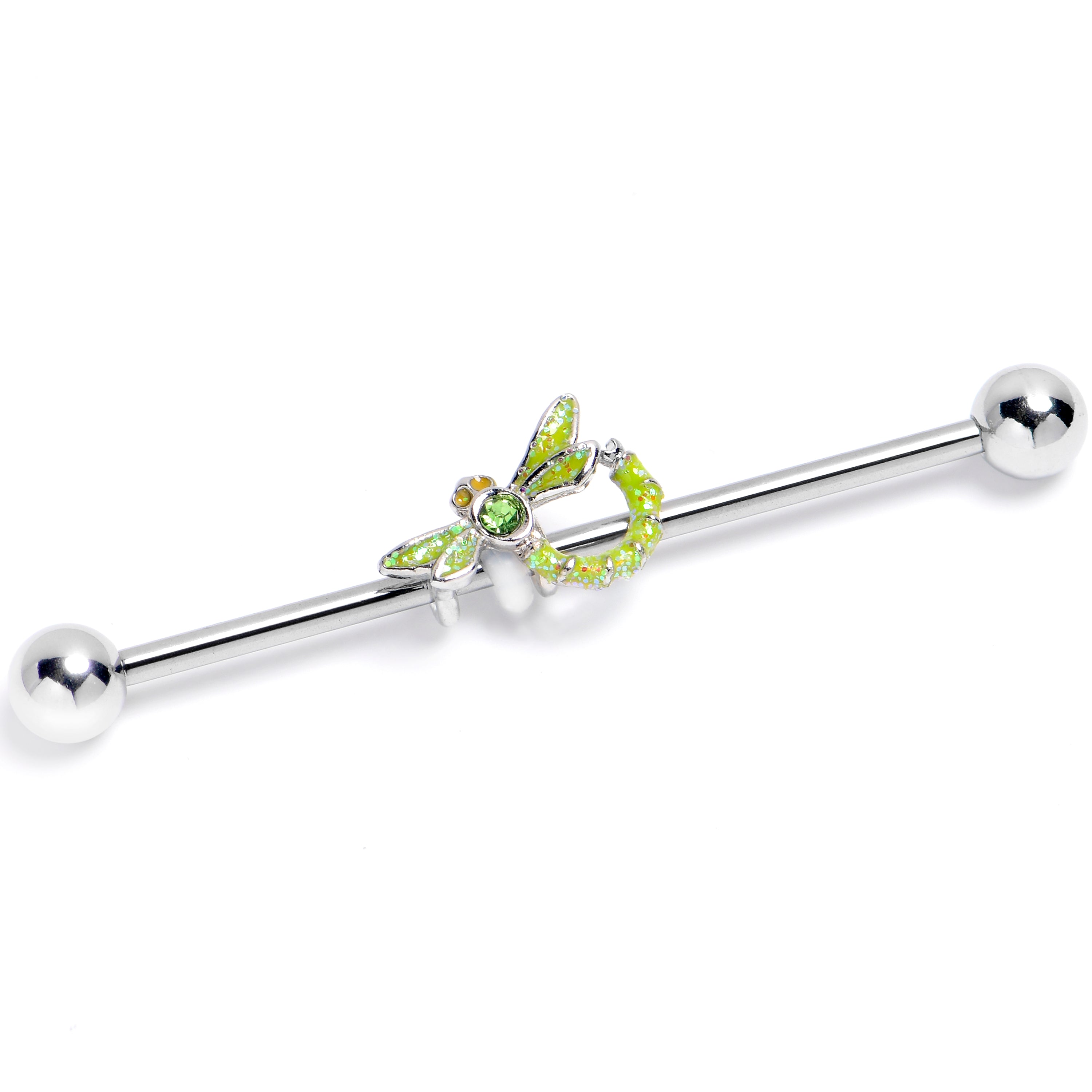 14 Gauge Green Gem Glitter Dragonfly Industrial Barbell 38mm