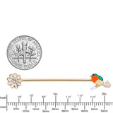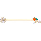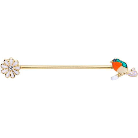 Let this beautiful bird pull up a perch and bloom in your industrial piercing with this 14 gauge helix barbell! It's made with a 1 1/2" gold tone PVD over 316L surgical grade stainless steel straight barbell. One end features a gorgeous orange and white songbird charm with a green gem eye and matching green embellishment. The other end features a white flower with a clear gem center. With such stunning details, this beautiful bird and flower industrial jewelry will make you want to burst into song!
