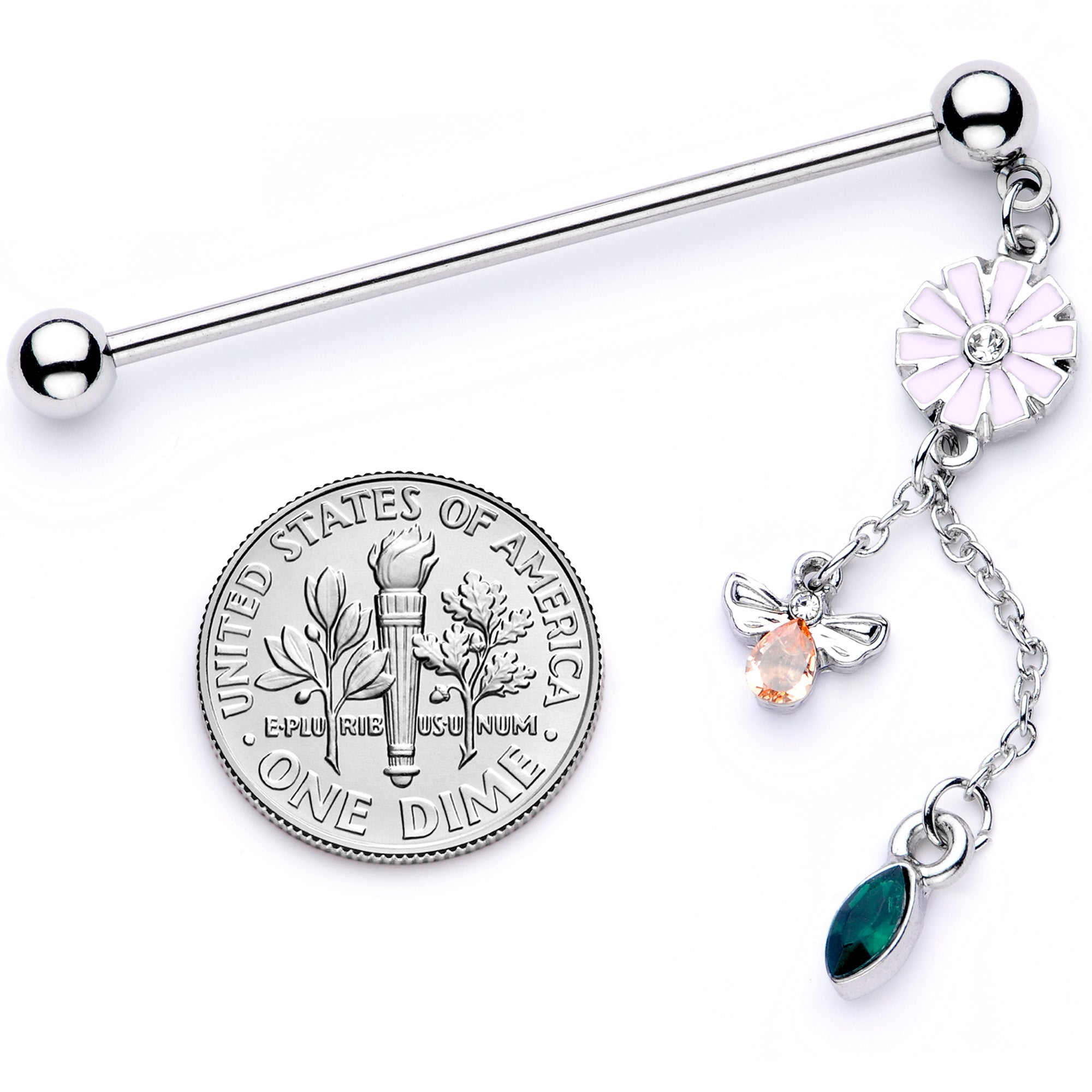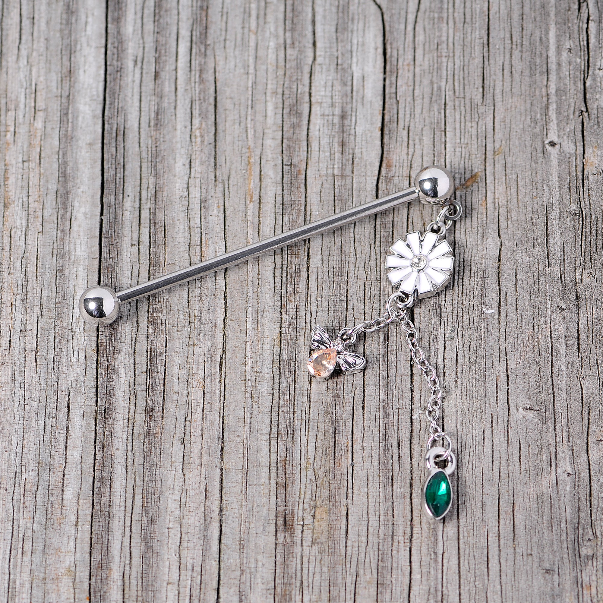 This 14 gauge helix barbell will draw eyes to your piercing like a bee.....to this flower! This barbell earring is made with a 1 1/2" durable 316L surgical grade stainless steel straight barbell with 5mm ball ends. Dangling from one ball end is a pink flower charm with a clear gem at its center. The flower supports two chains. Dangling from the shorter chain is a small bee charm, with a yellow gem for its body and a clear gem for its head. Dangling from the longer chain is a deep green gem with a striking cats-eye shape charm. The contrast of colors is absolutely spectacular. This industrial earring is sure to have everyone buzzing!