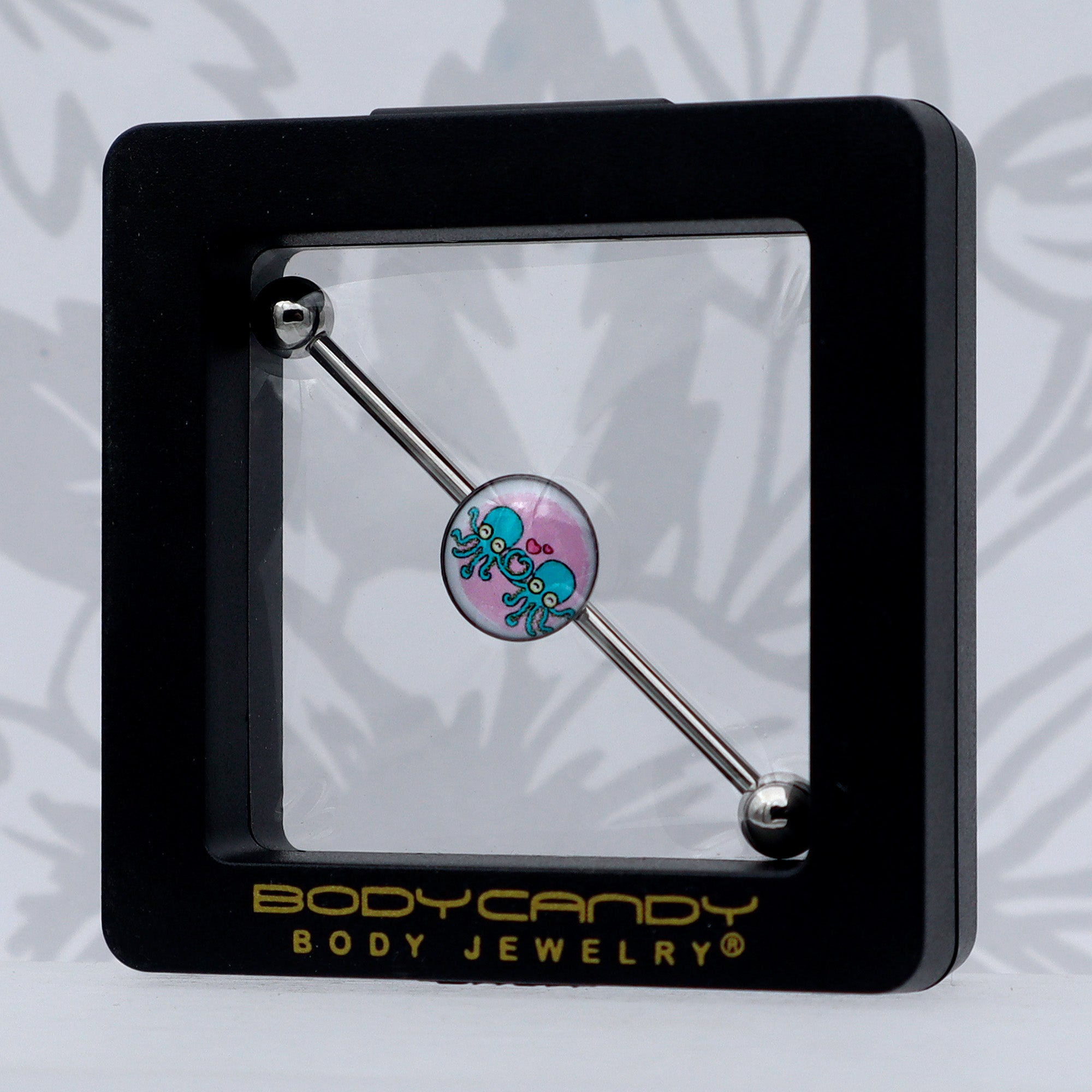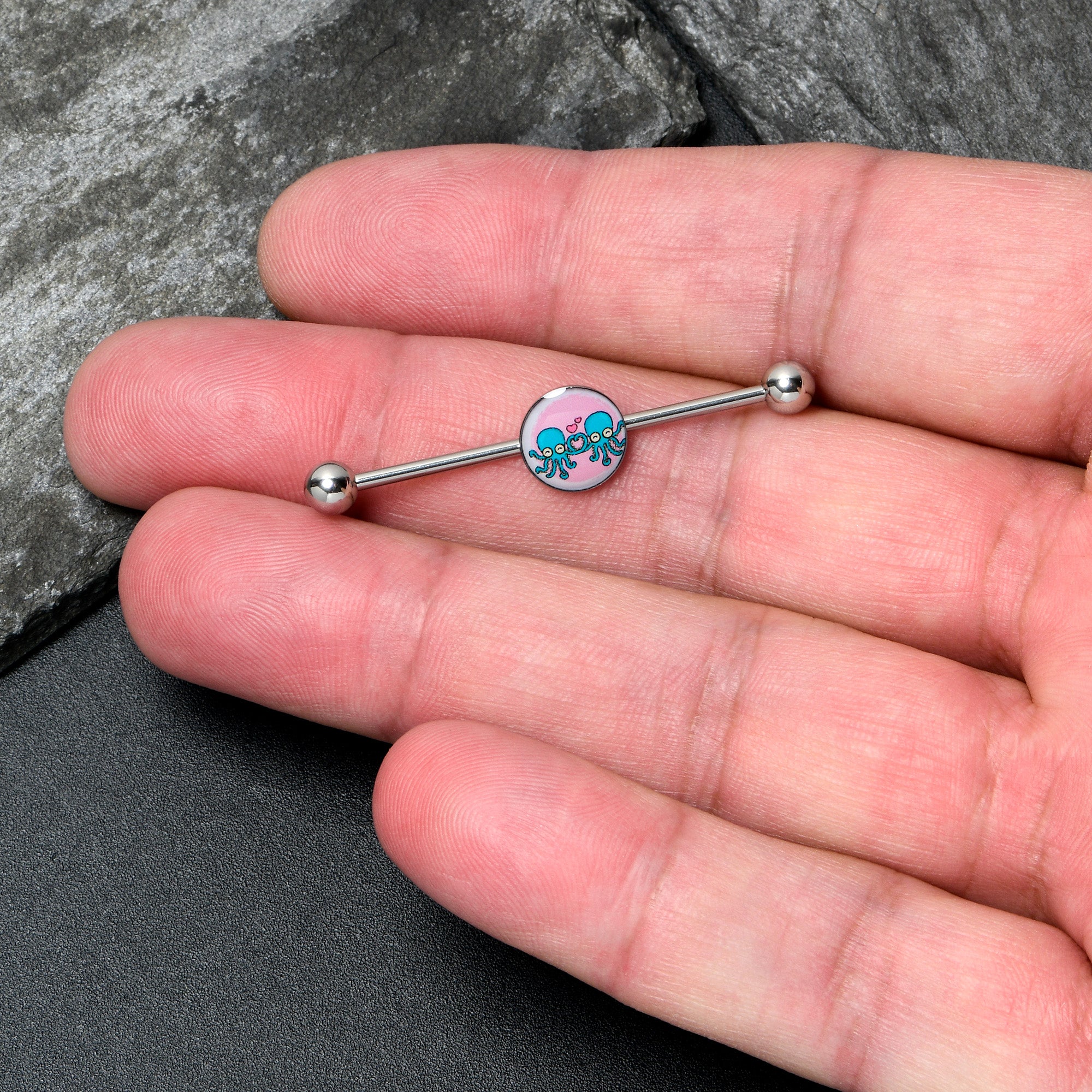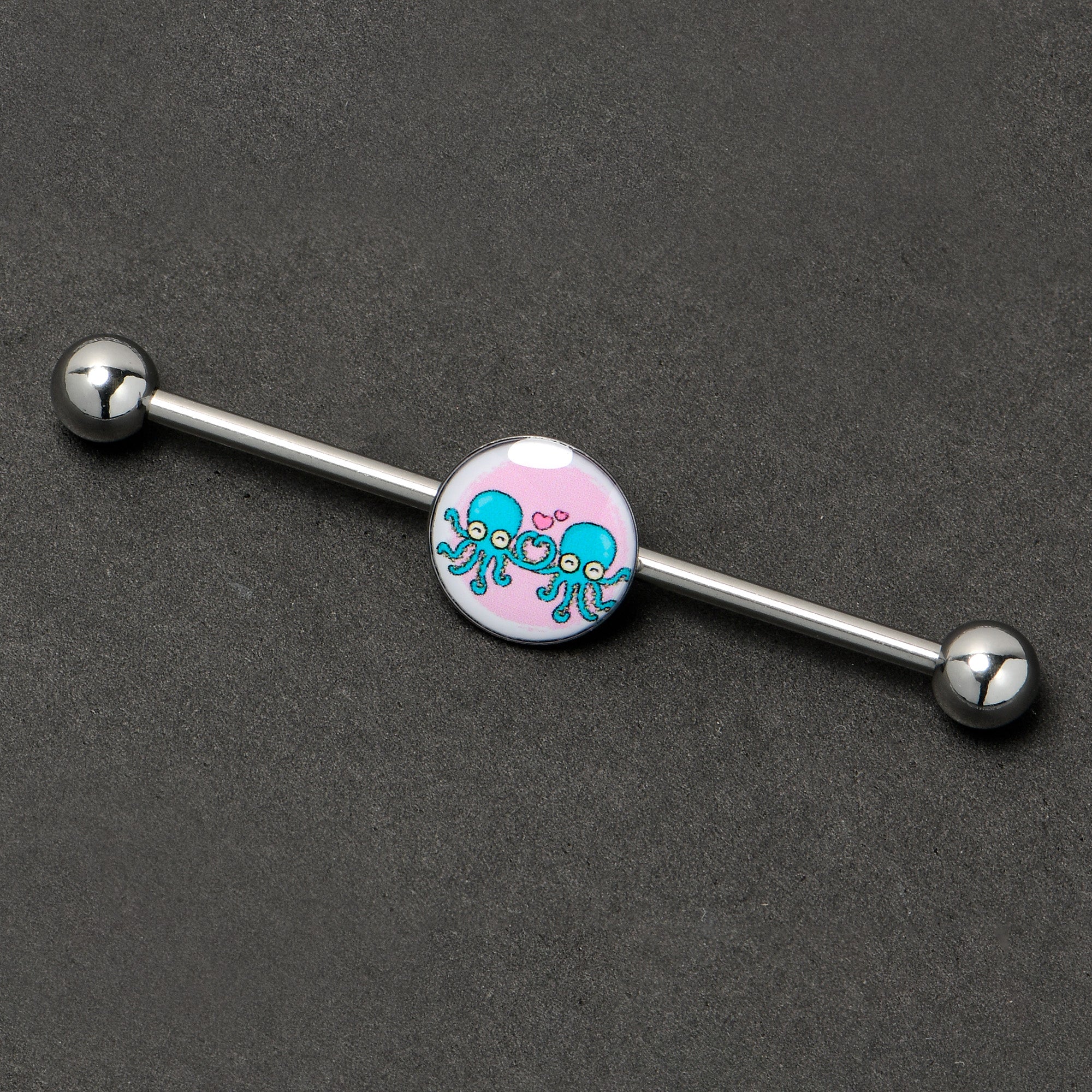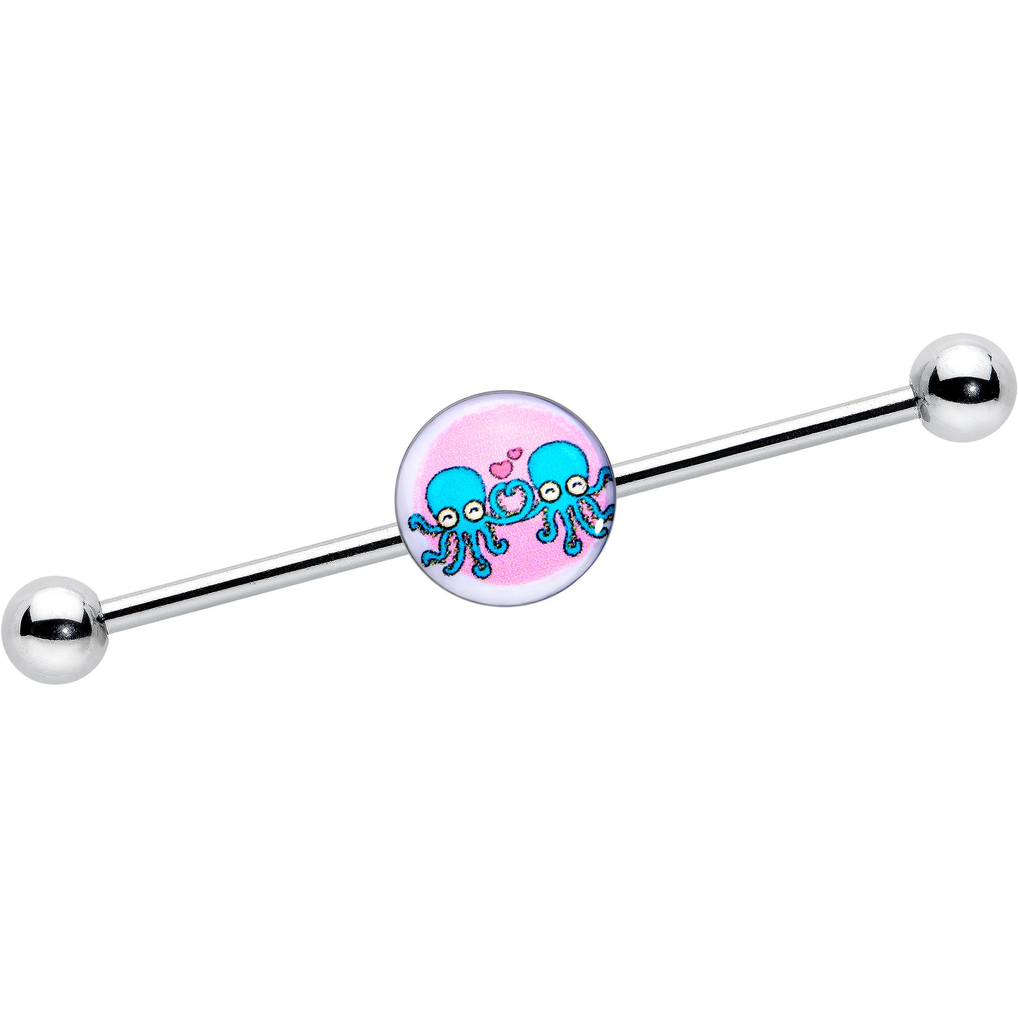 Feel the love with your heart, or with all eight legs when you are rocking this 14 gauge helix barbell. It is made with a 1 1/2 inch 316L surgical grade stainless steel straight barbell with 5mm ball ends. It features a pink disc charm that show a pair of blue octopi, embellished with a deep pink heart above them. You can slide these cephalopods up and down the length of the barbell for the perfect look. Let love take you in its tentacles with this awesome octopus barbell earring.