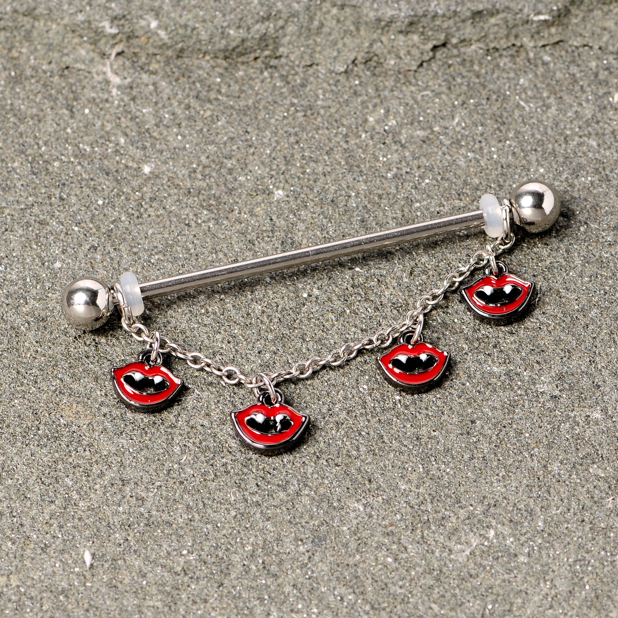 If you're looking for something scary to speak volumes for you this Halloween then this 14 gauge barbell earring is a great choice. Made with a 1 1/2" durable 316L surgical grade stainless steel straight barbell, this industrial earring features a moveable chain dangle with red monster mouth fang dangle charms and 5mm ball ends.