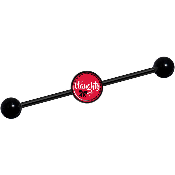 Get decked out from head to toe in Christmas spirit when you wear this festive 14 gauge holiday industrial piercing! Made with a 1.45" black anodized titanium over 316L surgical grade stainless steel straight barbell, this holiday industrial earring features the word "Naughty" (for those of you who weren't nice this year) with a bow on a red background nonmoving logo inlay charm. This Christmas barbell earring makes a perfect seasonal gift too.
