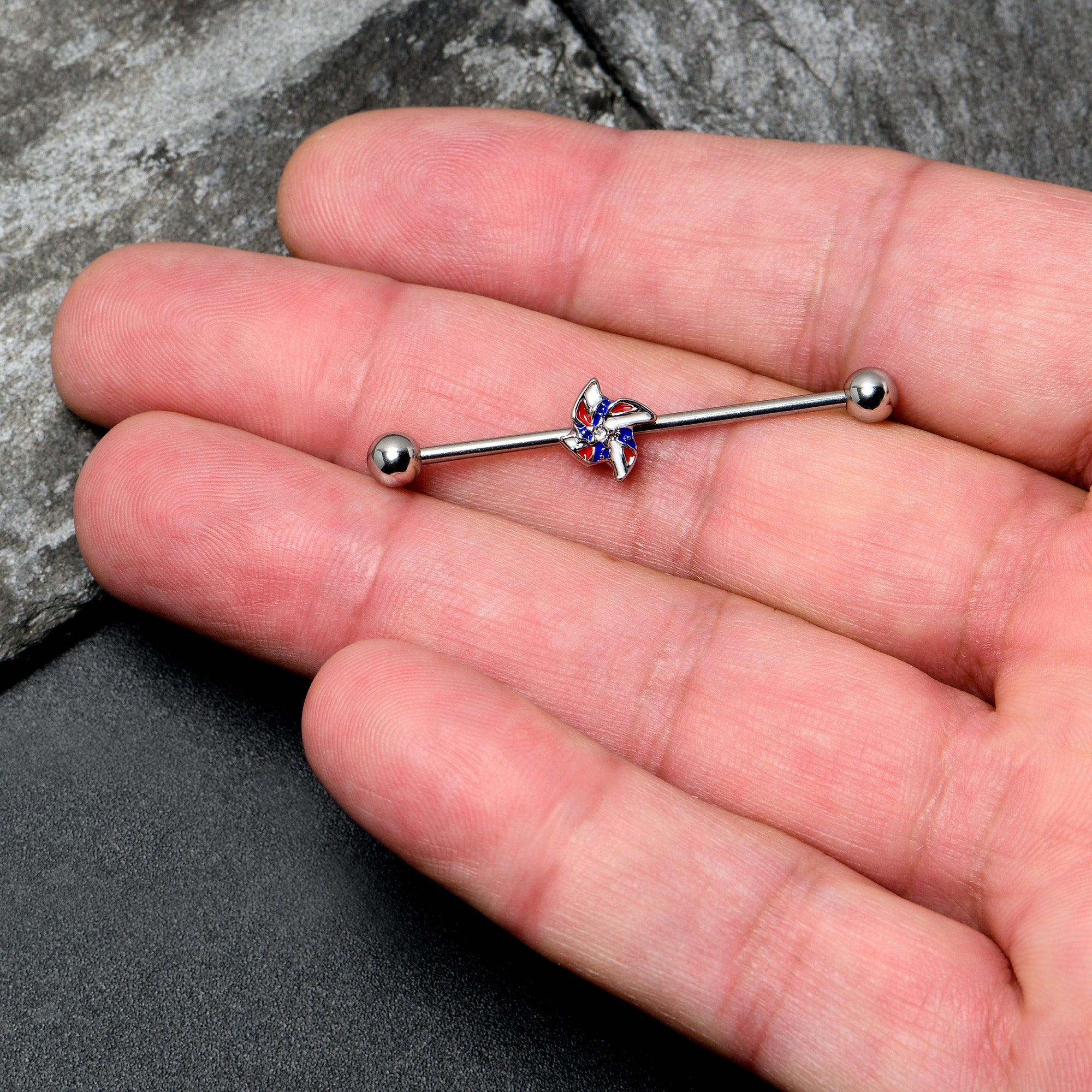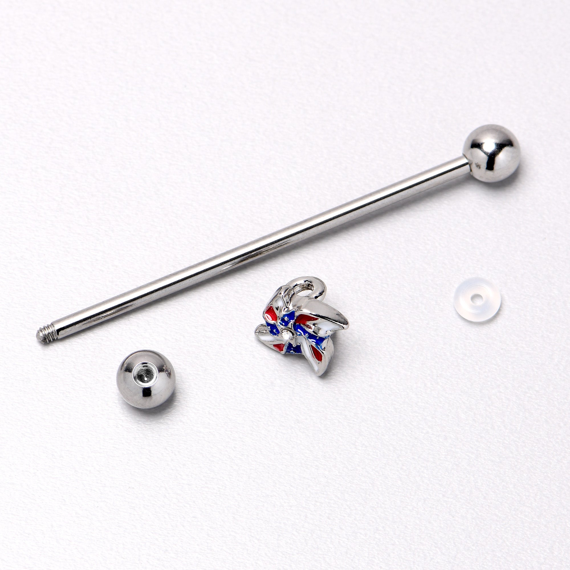 Give a new patriotic look a whirl, like with this 14 gauge helix barbell. It is made with a 1 1/2 inch 316L surgical grade stainless steel straight barbell with 5mm ball ends. It features a pinwheel charm, embellished in red, white, and blue inlay. You can even slide it up and down the length of the barbell for the perfect look. This patriotic barbell earring will make your head spin!