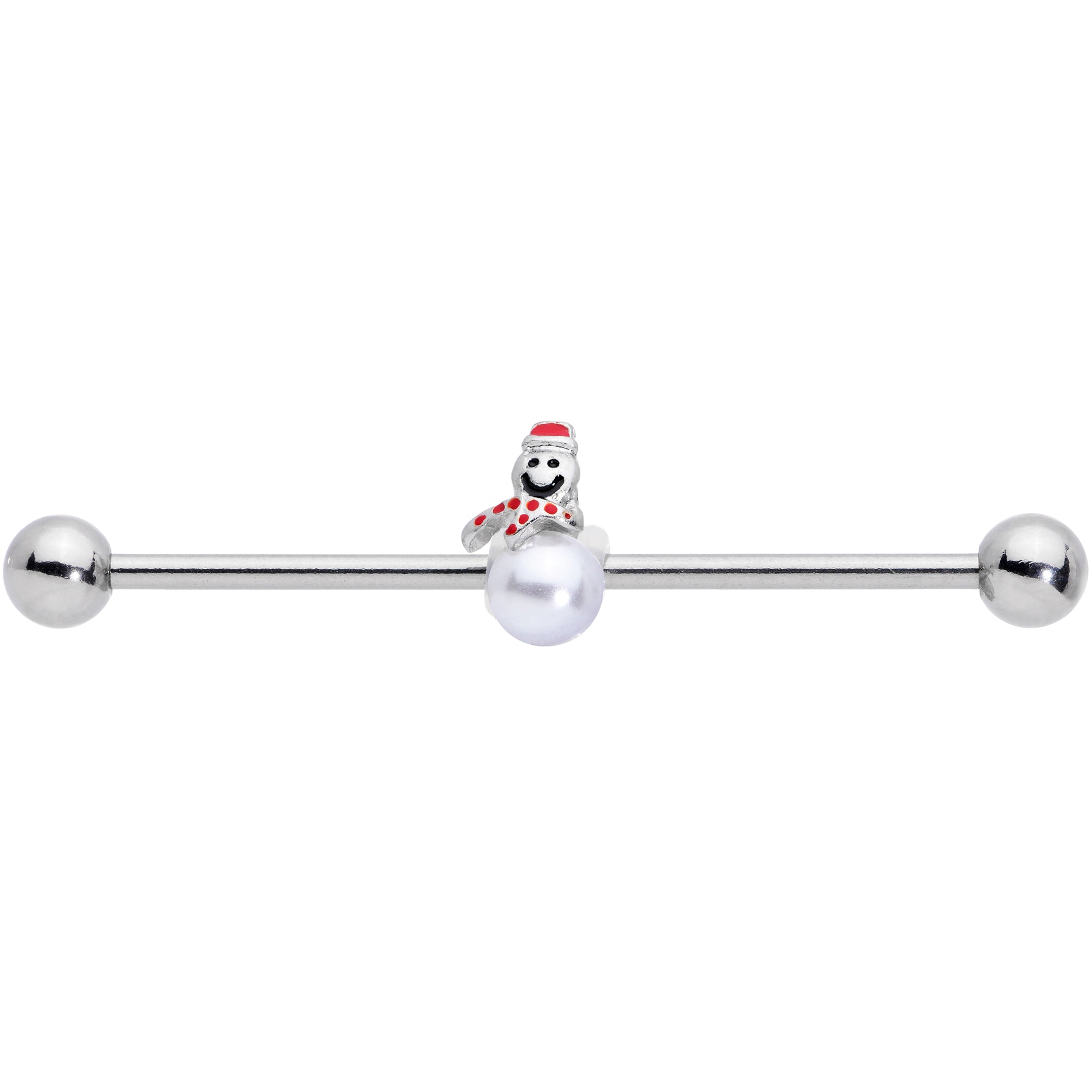 When the weather's frosty, this 14 gauge helix barbell is sure to warm your heart! It's made with a 1 1/2" durable 316L surgical grade stainless steel straight barbell with 5mm ball ends. It features a snowman charm made of a white pearlescent and red hat and scarf, and is wearing a big cheerful smile. And you can slide this snowman up and down the length of the barbell to get just the look you're wishing for! This happy soul is sure to bring charm and cheer to your industrial piercing this winter!