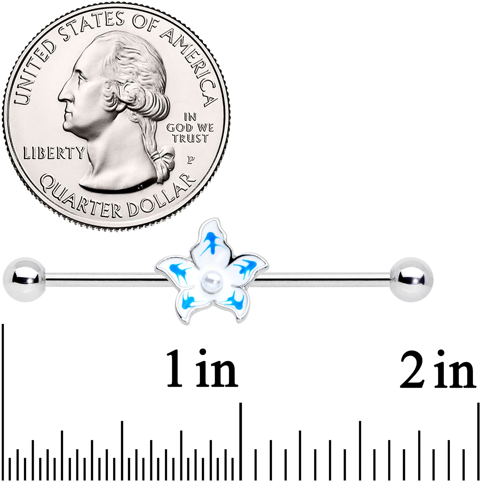 14 Gauge Pearly White Orb Blue Flower Industrial Barbell 38mm