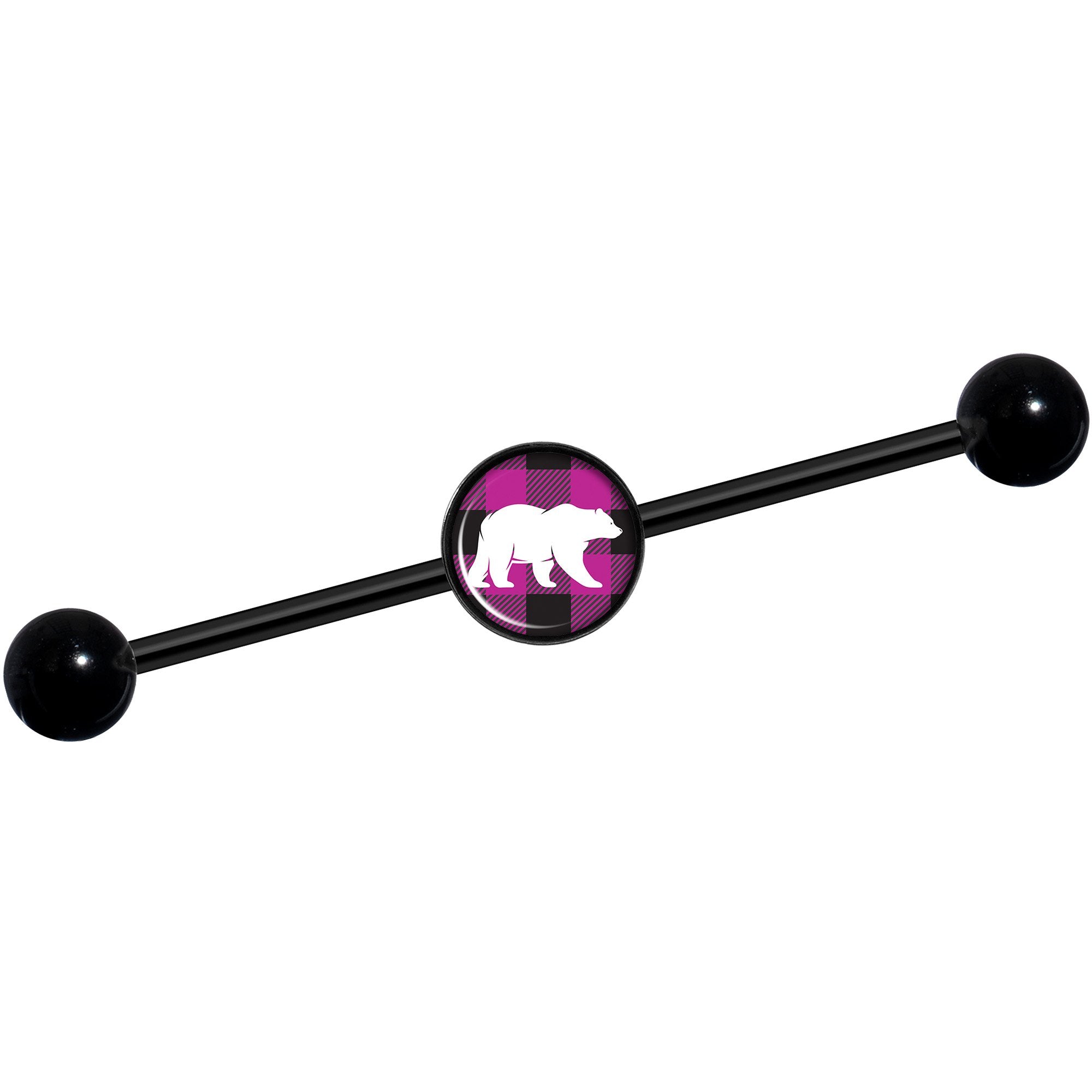 ,14 Gauge Pink Black Plaid Polar Bear Black Industrial Barbell 37mm