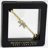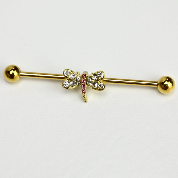 14 Gauge Pink Clear Gem Gold Tone Dragonfly Industrial Barbell 38mm