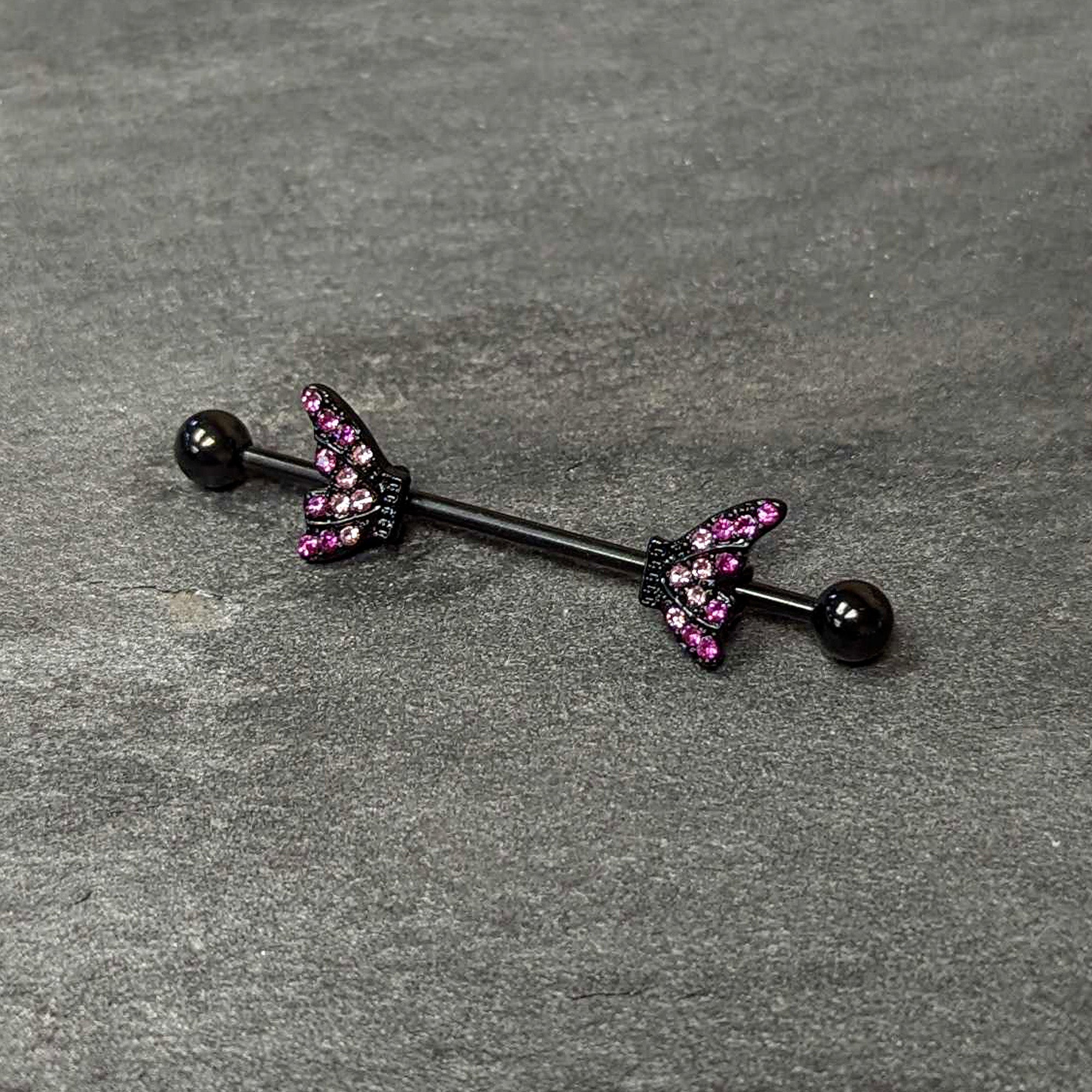 Even butterflies like to come out at night, like on this 14 gauge helix barbell! It's made with a 1 1/2" black PVD over 316L surgical grade stainless steel straight barbell with 5mm ball ends. It features a matching black butterfly wings charm. The wings are paved with pink gems for a gorgeous color contrast that's sure to get noticed. You can even slide them separately up and down the length of the barbell for the perfect look! Let your look fly by night with this marvelous midnight butterfly wings barbell earring!
