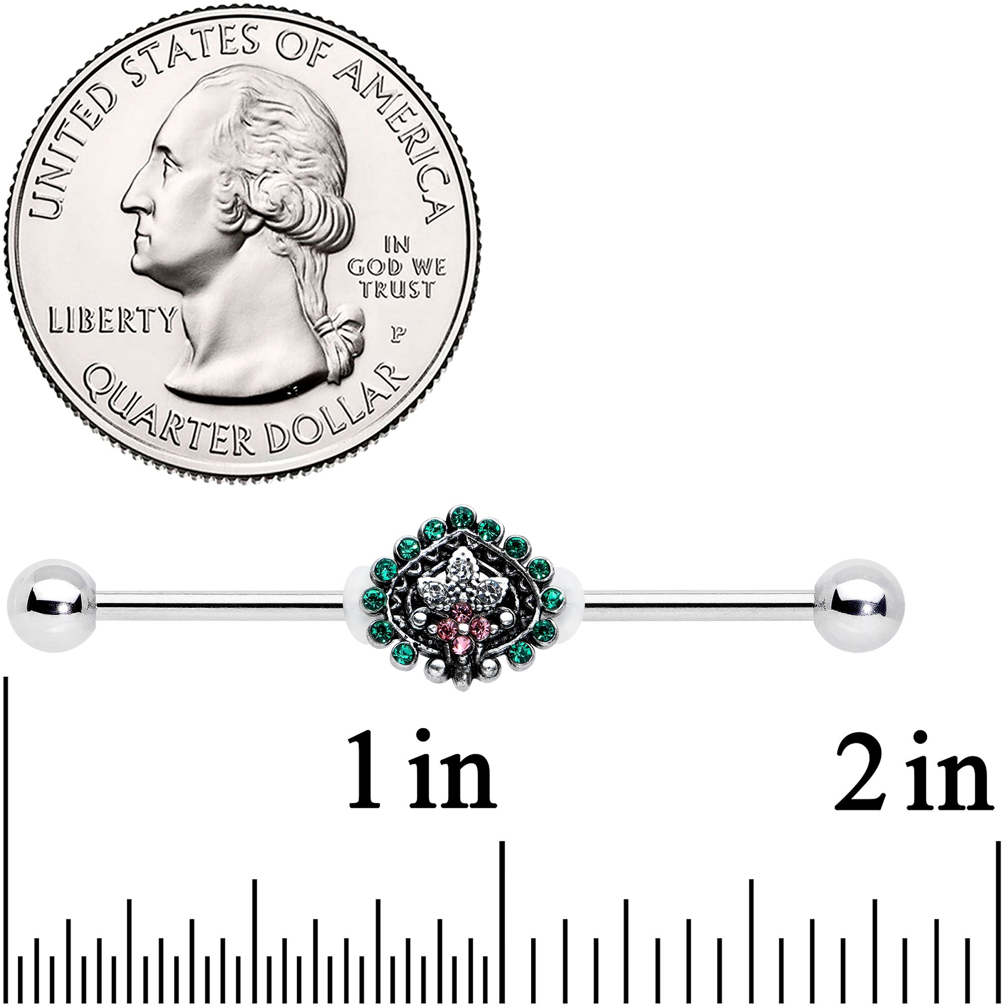 14 Gauge Pink Green Gem Stylized Leaf Industrial Barbell 38mm