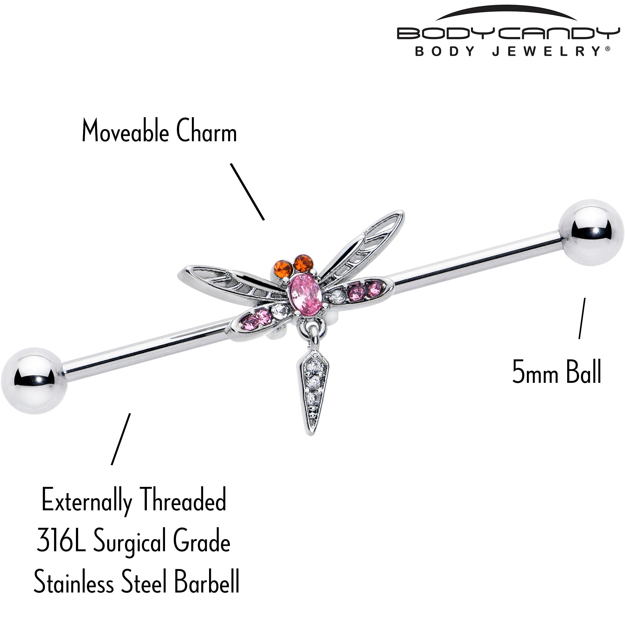 14 Gauge Pink Orange Gem Swank Dragonfly Dangle Industrial Barbell 38mm