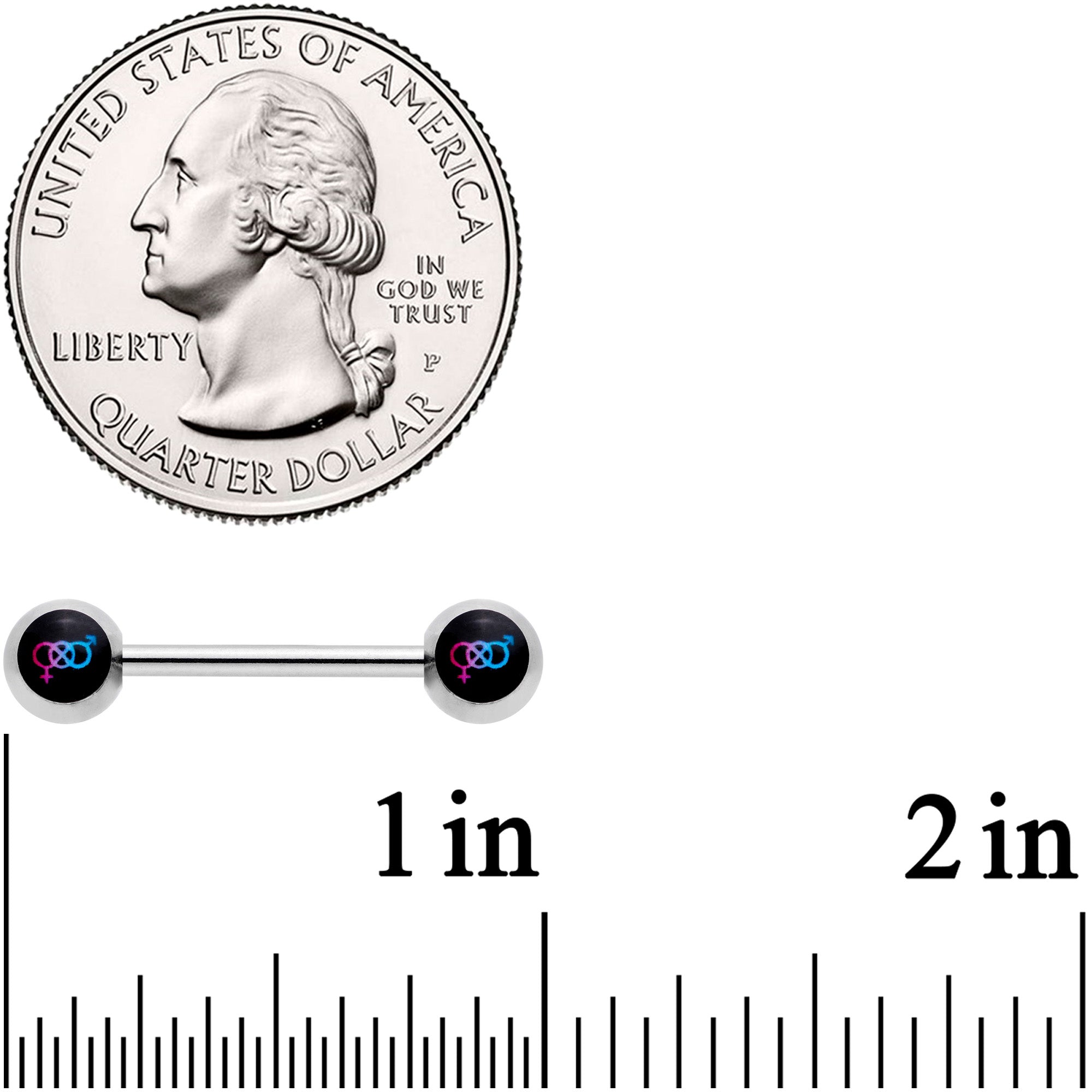 Show off your support for bisexual rights when you wear this 14 gauge nipple jewelry! This pair of nipple piercings are made with 14mm durable 316L surgical grade stainless steel straight barbells and has 5mm ball ends and feature bisexual pride logo inlay ball ends in pink, purple, and blue so you can show your support for all. Sold as a set of two.