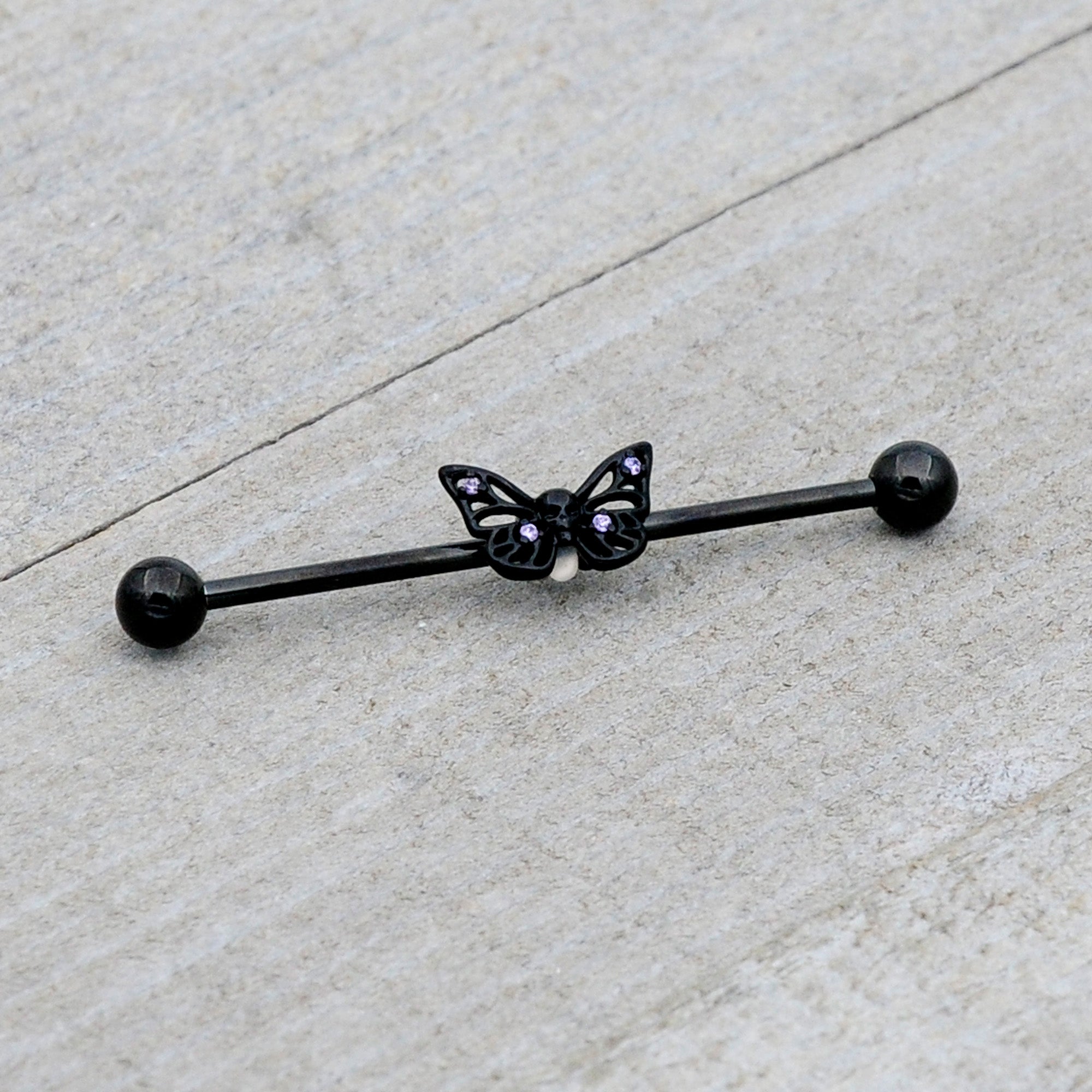 14 Gauge Purple CZ Gem Black Skull Butterfly Industrial Barbell 38mm