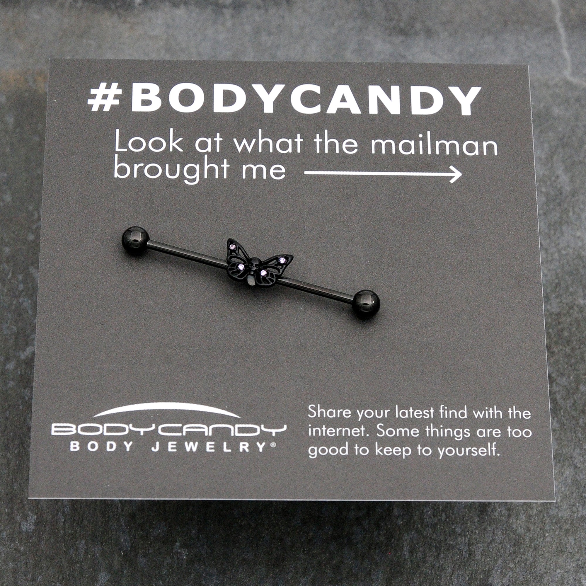 Even butterflies like to play in the dark, like on this 14 gauge helix barbell. It is made with a 1 1/2 inch black PVD over 316L surgical grade stainless steel straight barbell with 5mm ends. It features a black butterfly charm. The butterfly has lacy, openwork wings which are embellished with petite purple cubic zirconia gems for a demure touch of color. It is further embellished with a raised skull at its center. You can even slide it up and down the length of the barbell for the perfect look. Let your look fly by night with this gothic butterfly barbell earring.