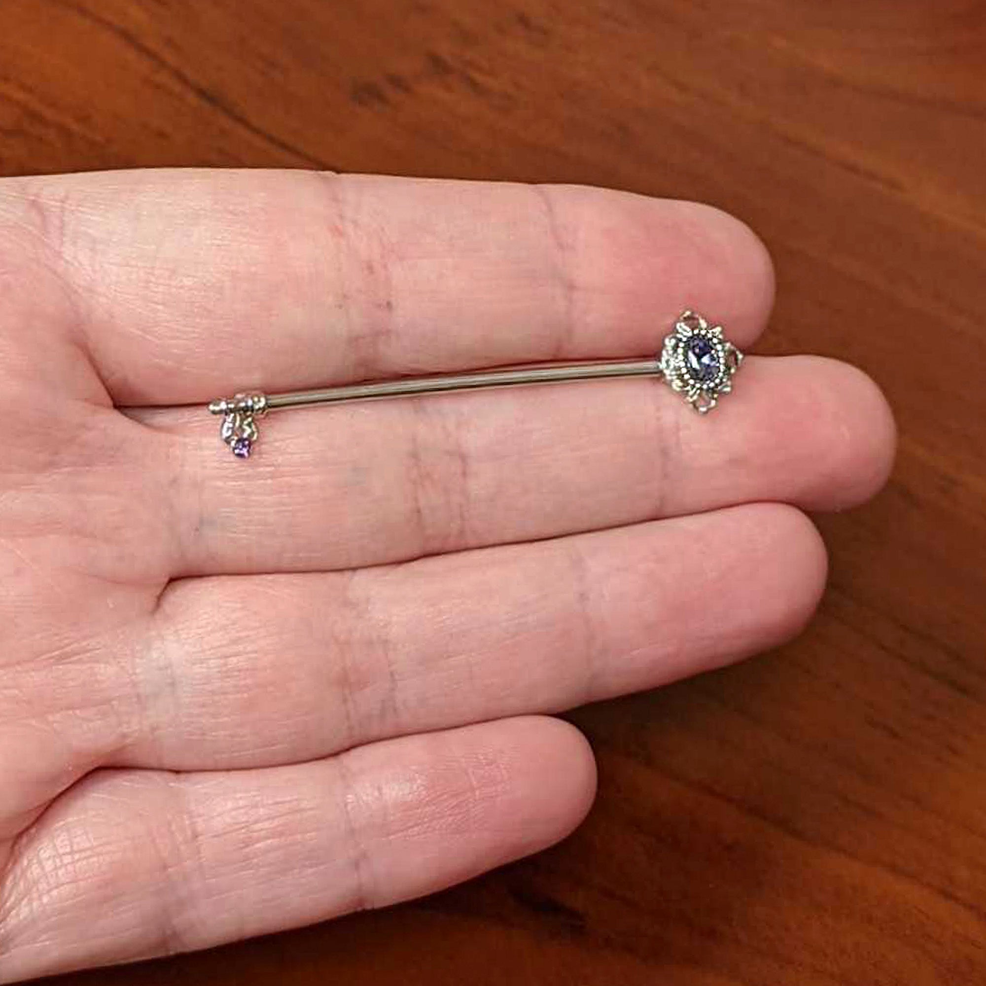 Unlock a whole new look with this 14 gauge helix barbell! It's made with a 1 1/2" durable 316L surgical grade stainless steel straight barbell. One end features the key's bow, composed of openwork hearts and set with a large purple gem at the center. The other end is the key's bit, embellished with a matching purple gem for a cohesive appearance. Unlock a look you're going to love with this classic, key-themed barbell earring!