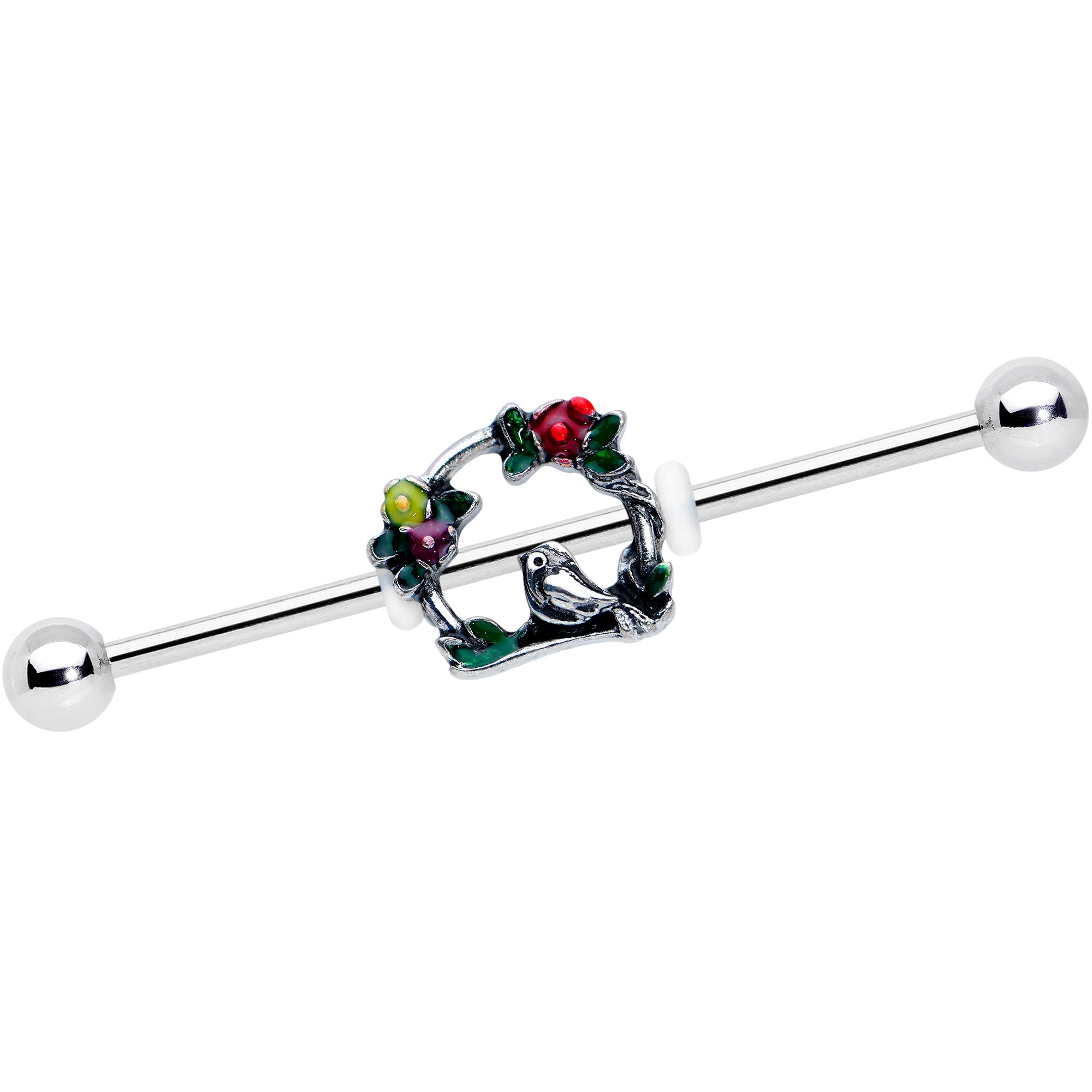 What a beautiful place for this bird to hang out, on this 14 gauge helix barbell! It's made with a 1 1/2" durable 316L surgical grade stainless steel straight barbell with 5mm ball ends. It features a bird charm perched on a swing. The swing is embellished with flowers in yellow, red and purple, with lots of green leaves for a lush and realistic look. You can even slide the swing up and down the length of the barbell for the perfect look. Your industrial piercing will be swinging like this beautiful bird when you wear this awesome avian helix barbell!