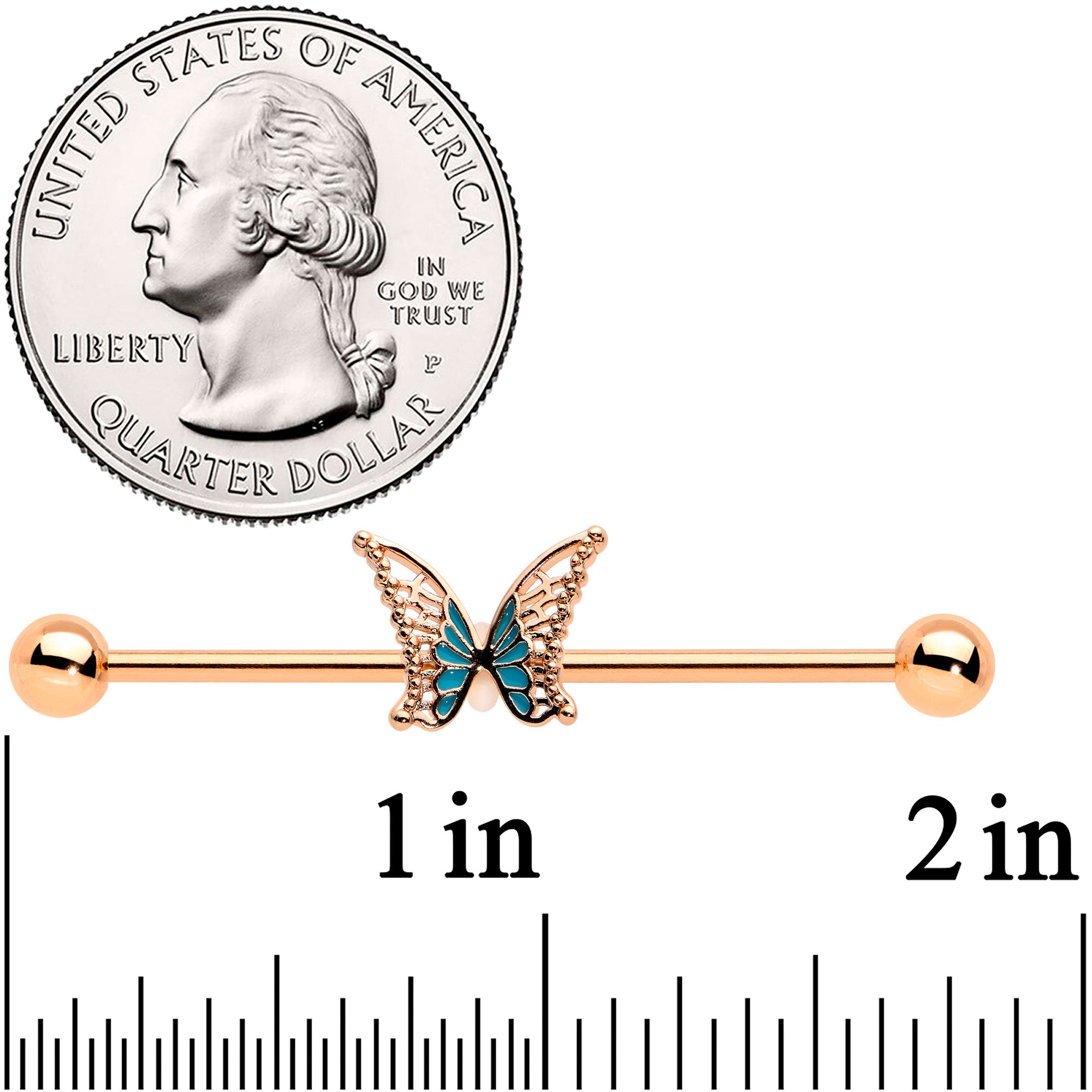 14 Gauge Rose Gold Tone Bit of Blue Butterfly Industrial Barbell 38mm