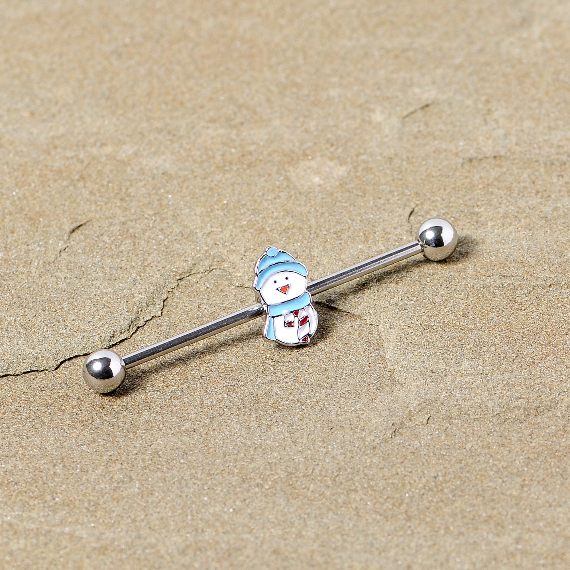 If you can't wait to walk around in a winter wonderland this Christmas season then you will love this 14 gauge industrial earring because it is so cool! Made with a 1 1/2" durable 316L surgical grade stainless steel straight barbell, this barbell industrial features a moveable snowman charm with a blue cap and scarf, and a candy cane too! Happy holidays to you!