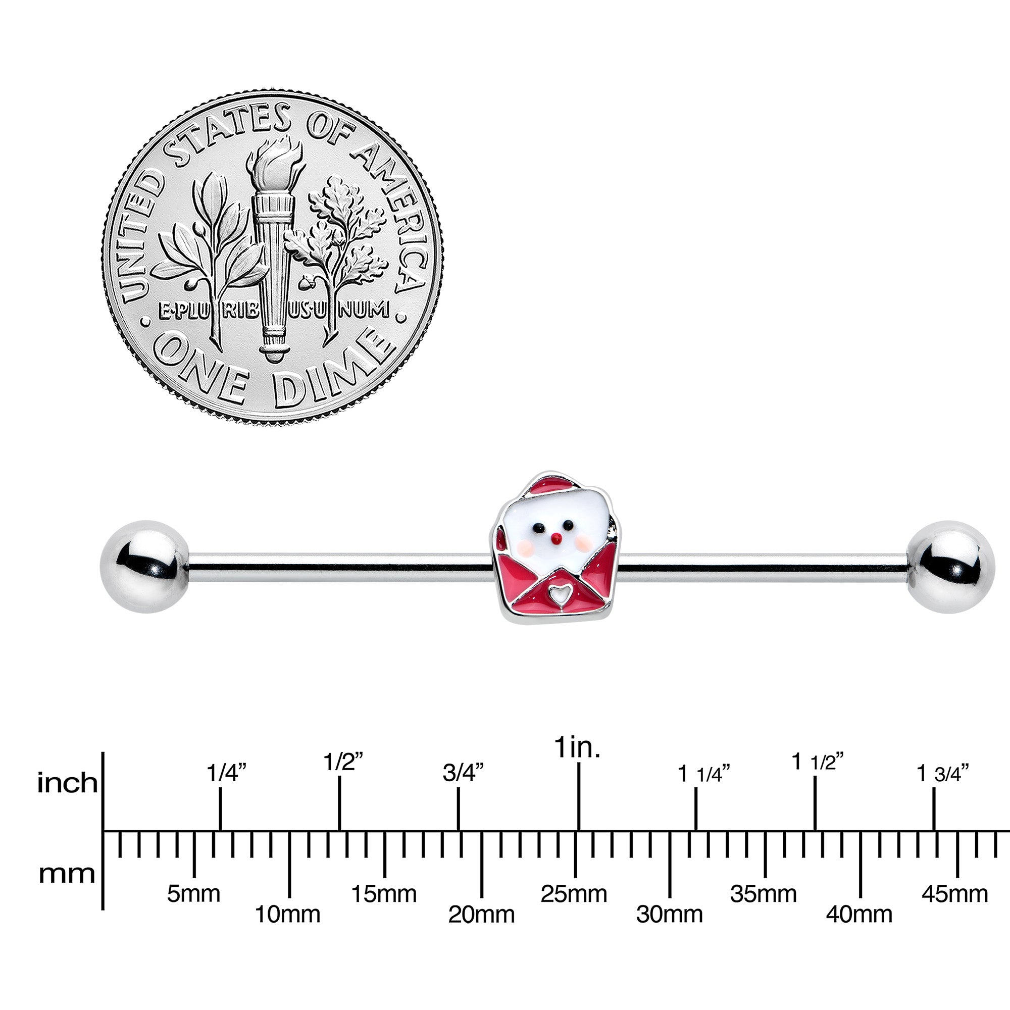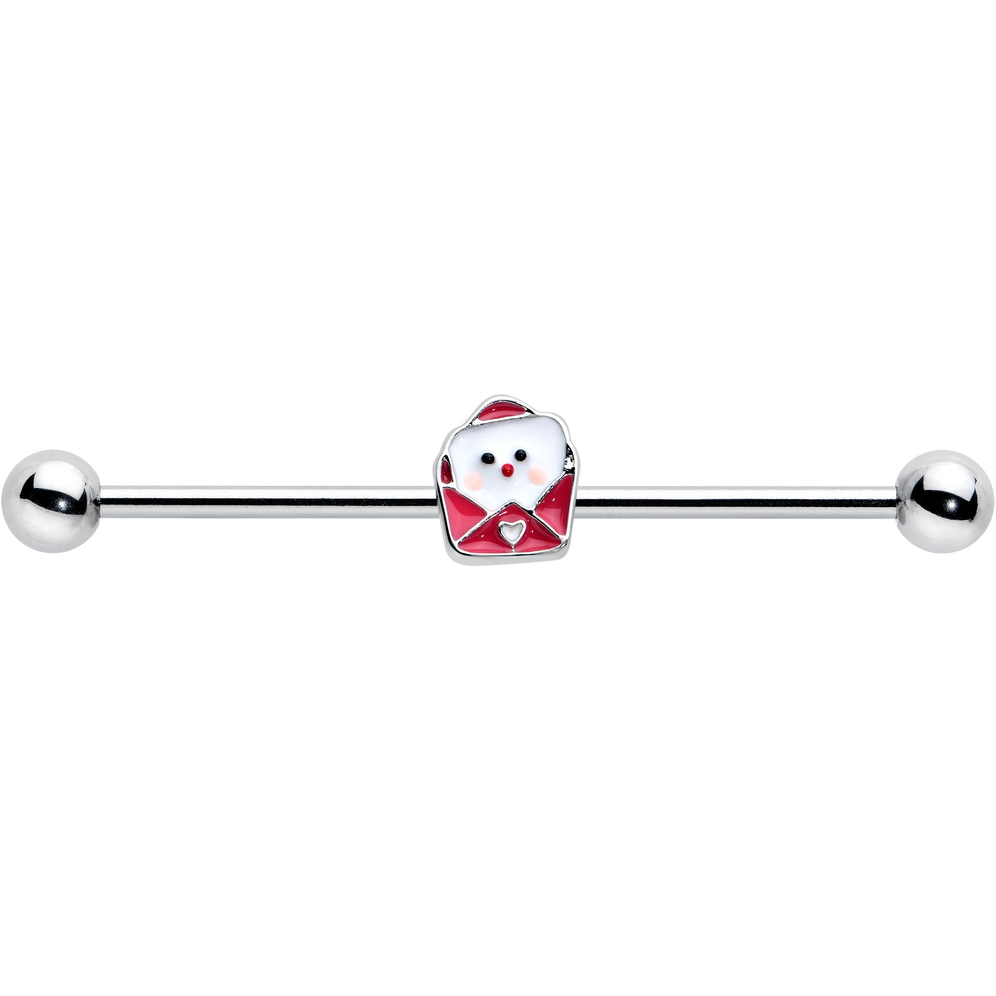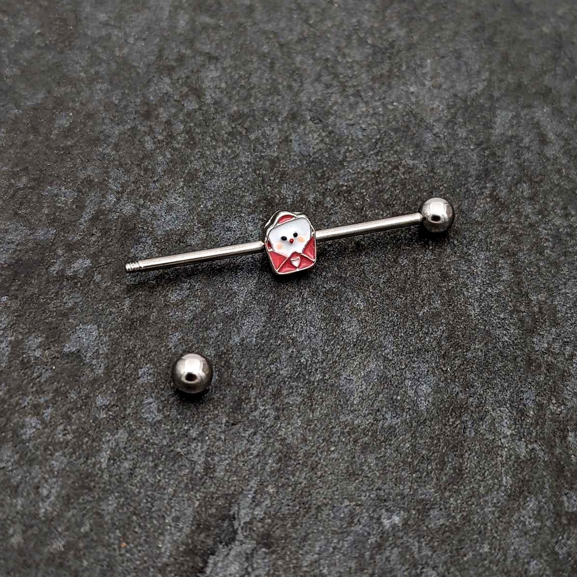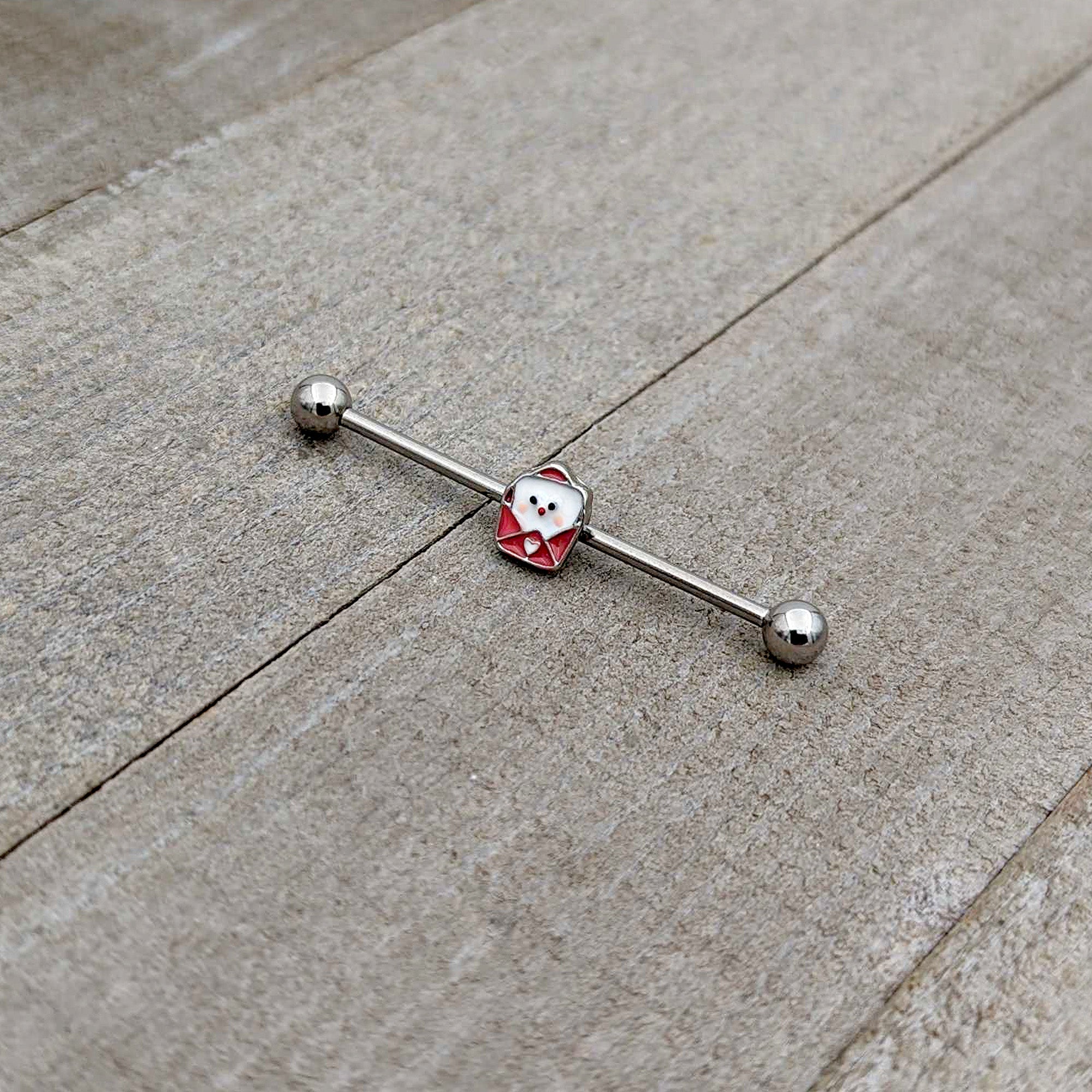 Tell your piercings how you really feel with this 14 gauge helix barbell! It's made with a 1 1/2" durable 316L surgical grade stainless steel straight barbell with 5mm ball ends. It features a valentine charm, with a red inlaid envelope and a white love letter peeking out. The envelope is further embellished with a small white heart and you can even slide the charm up and down the length of the barbell for the perfect look. Express yourself with this endearing Valentine's Day barbell earring!