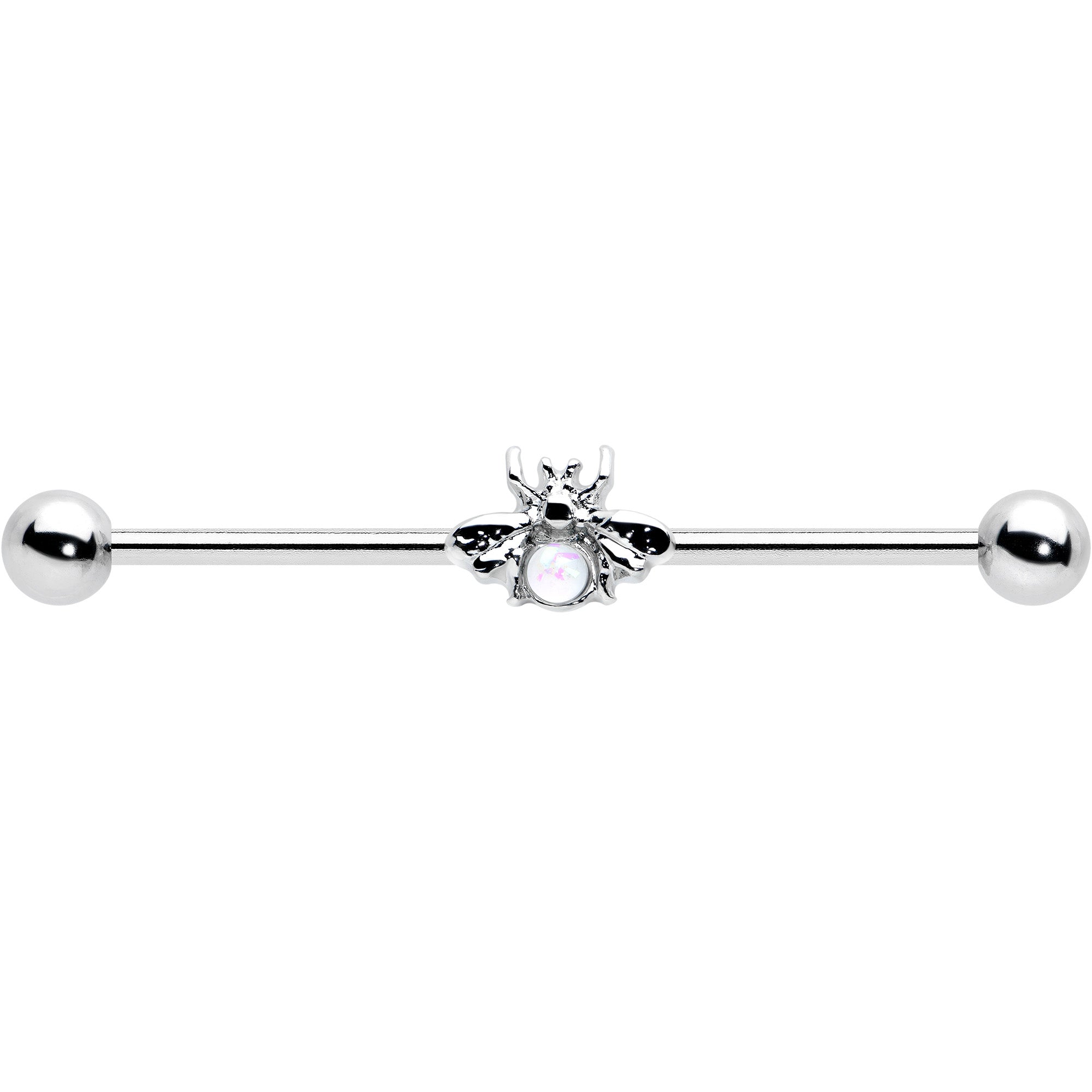 This 14 gauge helix barbell is sure to give you one honey of a new look! It's made with a 1 1/2" durable 316L surgical grade stainless steel straight barbell with 5mm ball ends. It features a bee charm, with the body composed of a single large white faux opal. It also features stylized wings and legs for a realistic and airy appearance and you can slide it up and down the barbell for the perfect look. This unconventional insect jewelry is sure going to make your industrial piercing look super sweet!