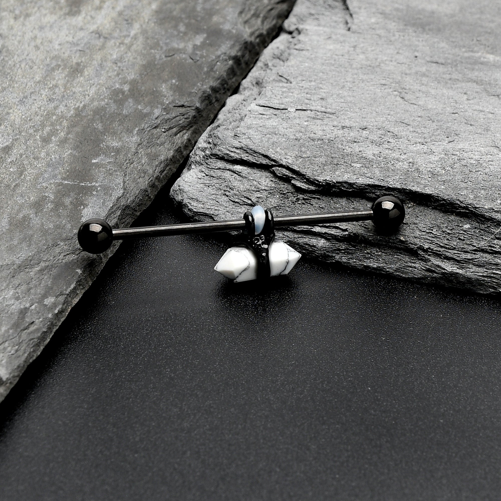 If you're into tie dye and incense, this 14 gauge helix barbell is sure to give you a happier aura! It's made with a 1 1/2" black PVD over 316L surgical grade stainless steel straight barbell with 5mm ball ends. Bound to the barbell with a band is a howlite stone, with its classic obelisk shape held in a claw-style setting. You can even slide the stone up and down the length of the barbell to get just the look you want. While we can't claim it has any magical powers, it will certainly look magical in your industrial piercing!