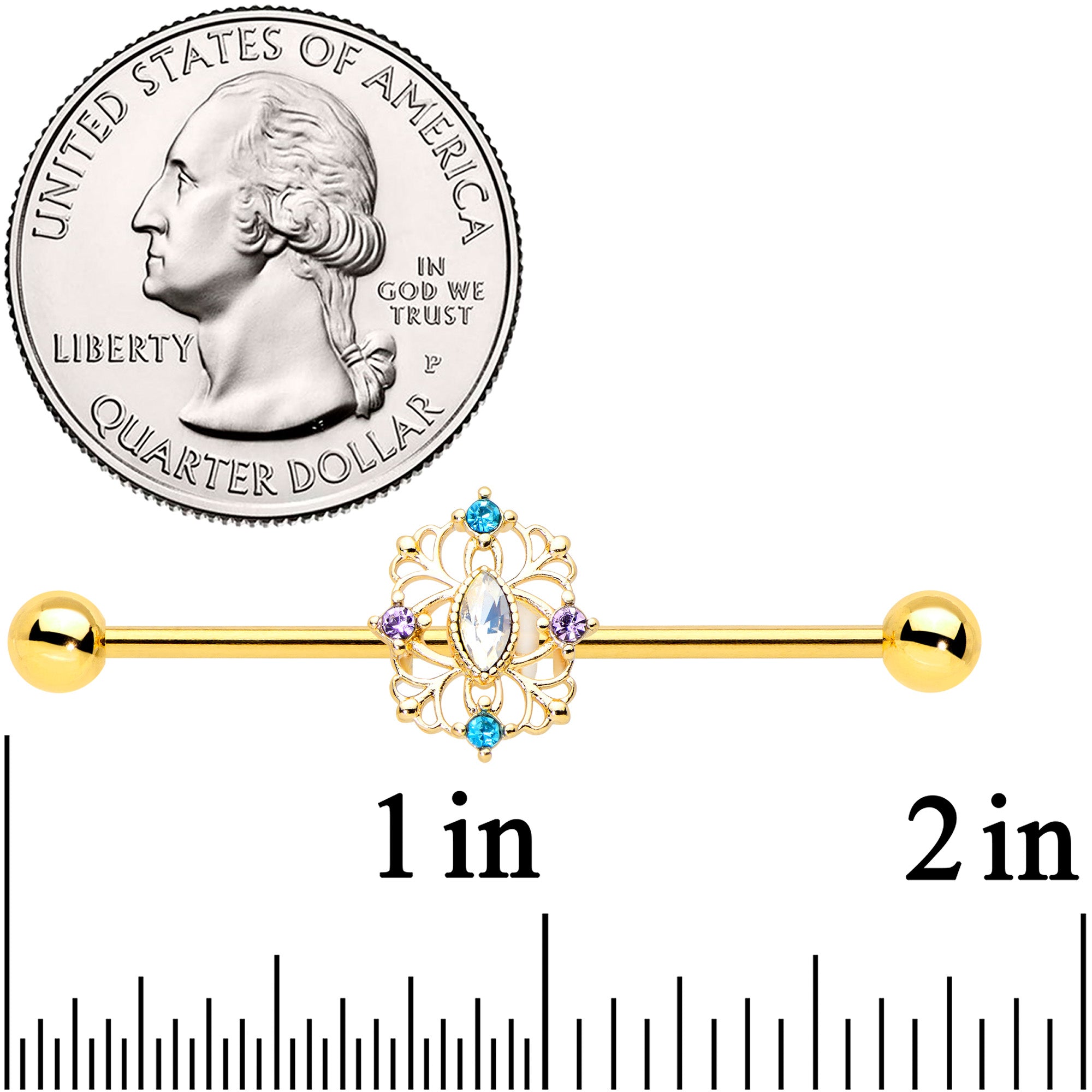 This 14 gauge floral helix barbell is sure to catch you in its web! It's made with a 1 1/2" gold tone PVD over 316L surgical grade stainless steel straight barbell with 5mm ends. It features an openwork flower charm, embellished at the edges with blue and purple gems. The open design gives it a web-like quality that's very airy and elegant and it's set at the center with a white synthetic opal. You can even slide the charm up and down the length of the barbell for the ideal look. You'll want to pick this flower for your piercings with this fabulous, floral barbell earring!