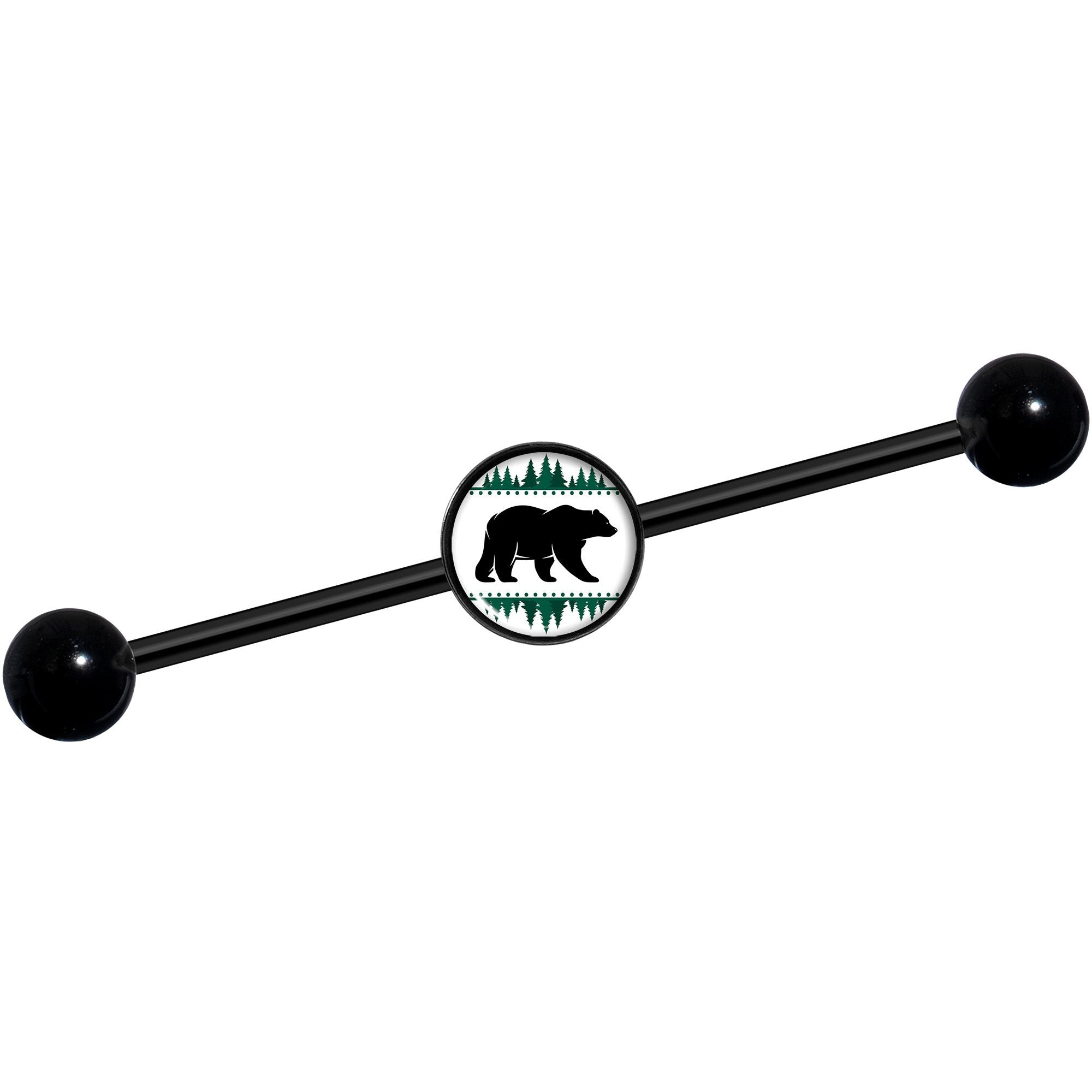 Get decked out from head to toe in Christmas spirit when you wear this festive 14 gauge holiday industrial piercing! Made with a 1.45" black anodized titanium over 316L surgical grade stainless steel straight barbell, this holiday industrial earring features a holiday polar bear in the woods nonmoving logo inlay charm. This Christmas barbell earring makes a perfect seasonal gift too.
