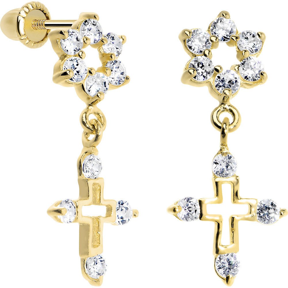 Young girl 14kt gold earrings. A sweet clear gem flower dangles a hollow cross dangle made of solid 14kt gold with an additional matching round gem in the center. These youth dangle earrings are comfortable and secure featuring screw backs.