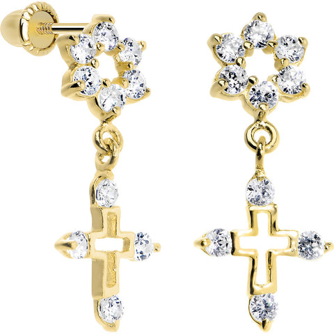 14K Yellow Gold Clear CZ Flower Cross Dangle Youth Earrings