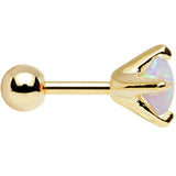 Adorn your cartilage piercing with a truly magnificent and beautifully simple 16 gauge earring featuring a 5mm white synthetic opal gem prong set at the end of the post. This tragus jewelry offers a sturdy straight barbell of 1/4" in length that is made from gold plated over 316L surgical grade stainless steel.