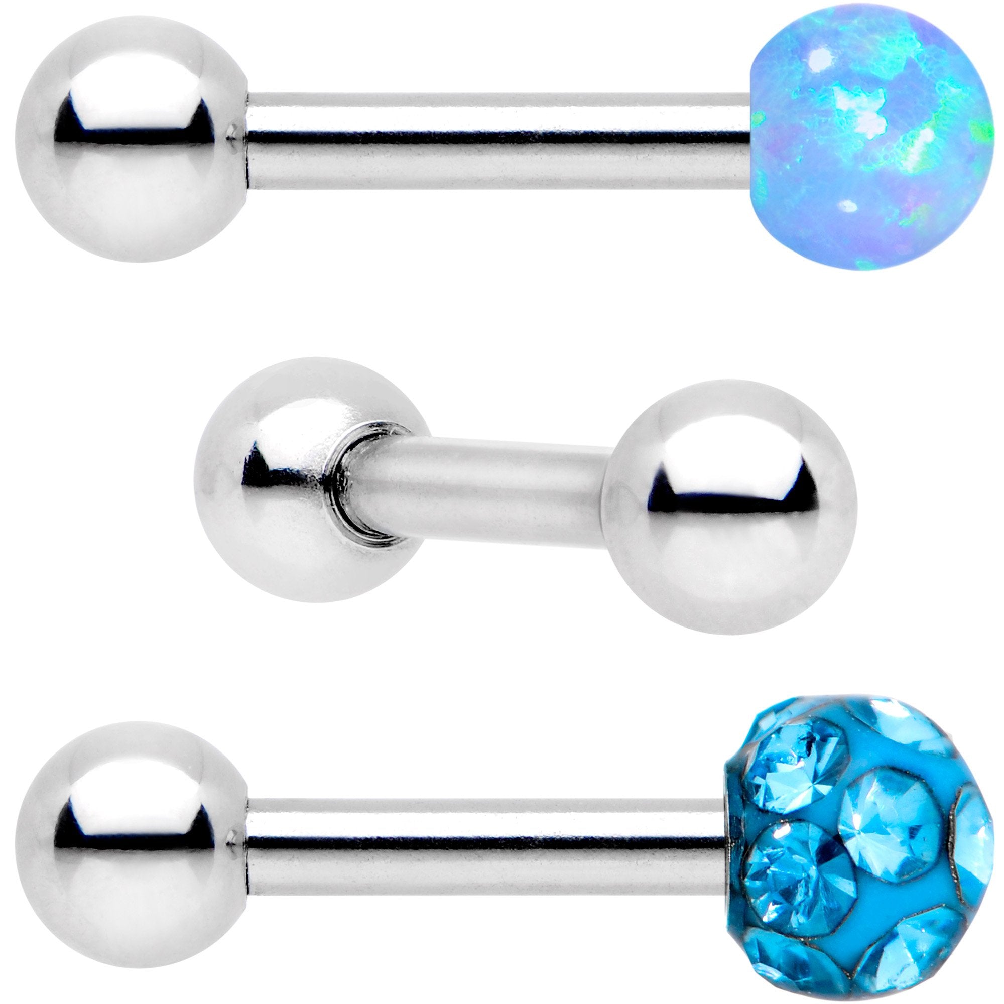 If you love options, then this is the perfect package of tragus and cartilage jewelry for you! This set of three 16 gauge straight barbells comes with one 3mm aqua gem cluster ball end, one 3mm aqua faux opal ball end, and four 3mm standard stainless steel balls