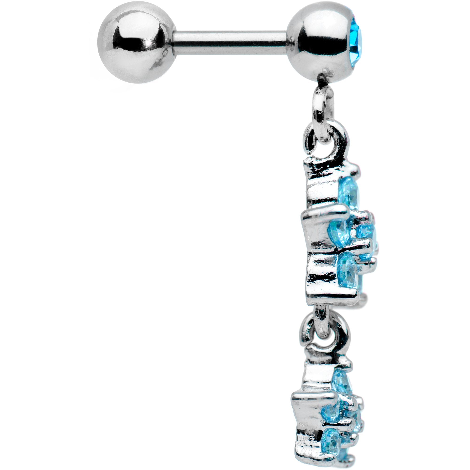 This awesome cartilage jewelry features not one star, but two! Two beautiful aqua gem star gems dangle from this fun 16 gauge cartilage tragus piercing. The star charms are mounted on a 6mm straight barbell made with durable 316L surgical grade stainless steel and capped with an extra aqua gem.