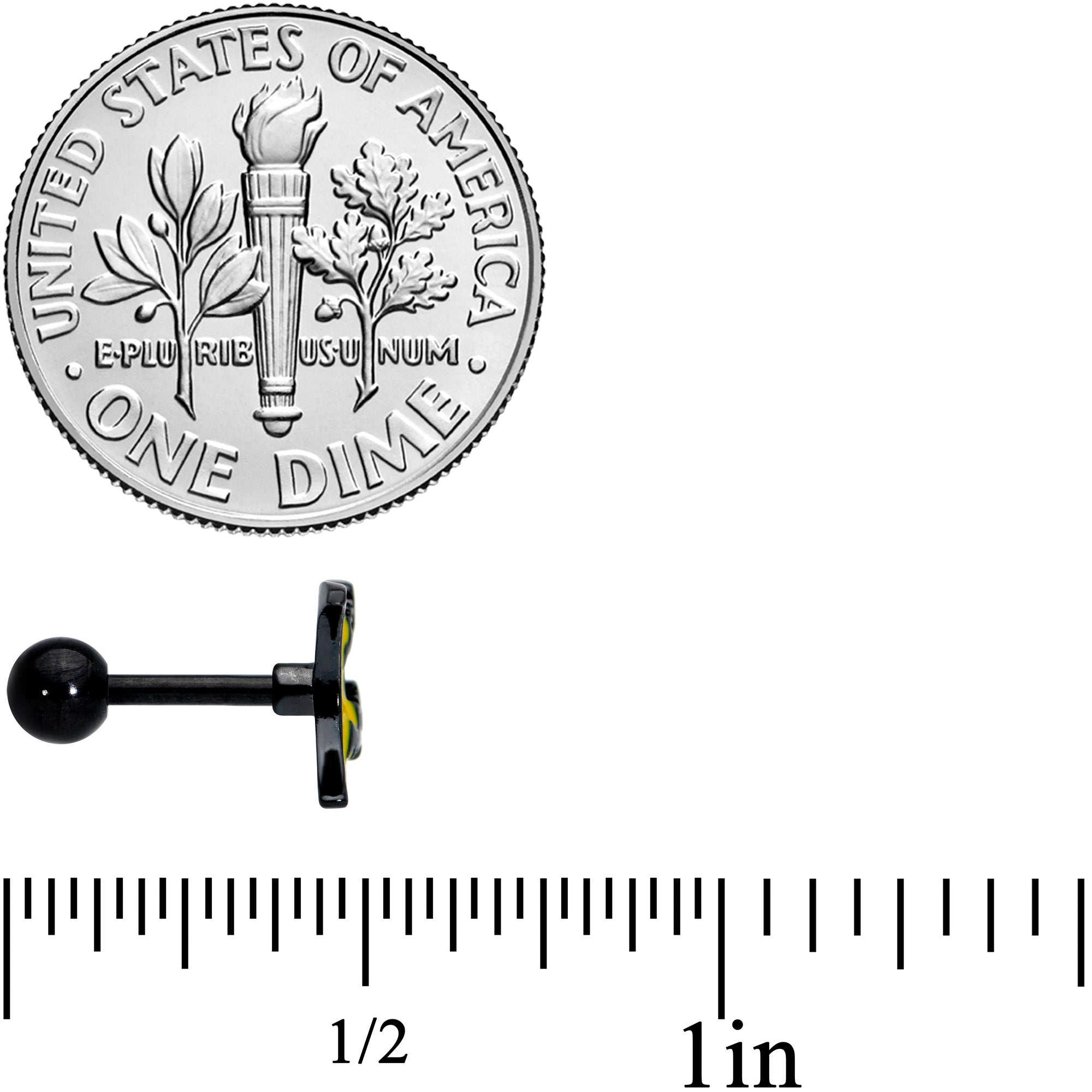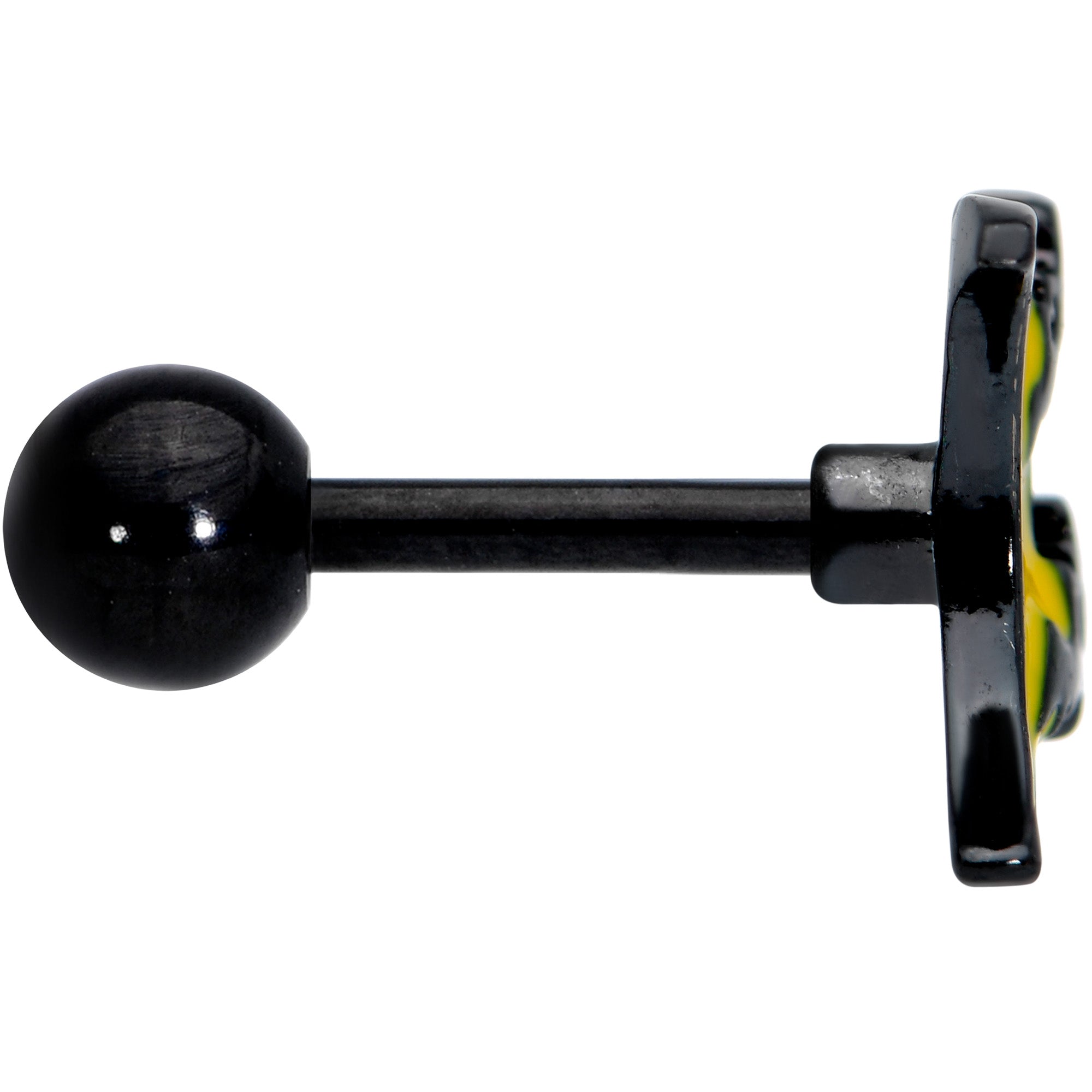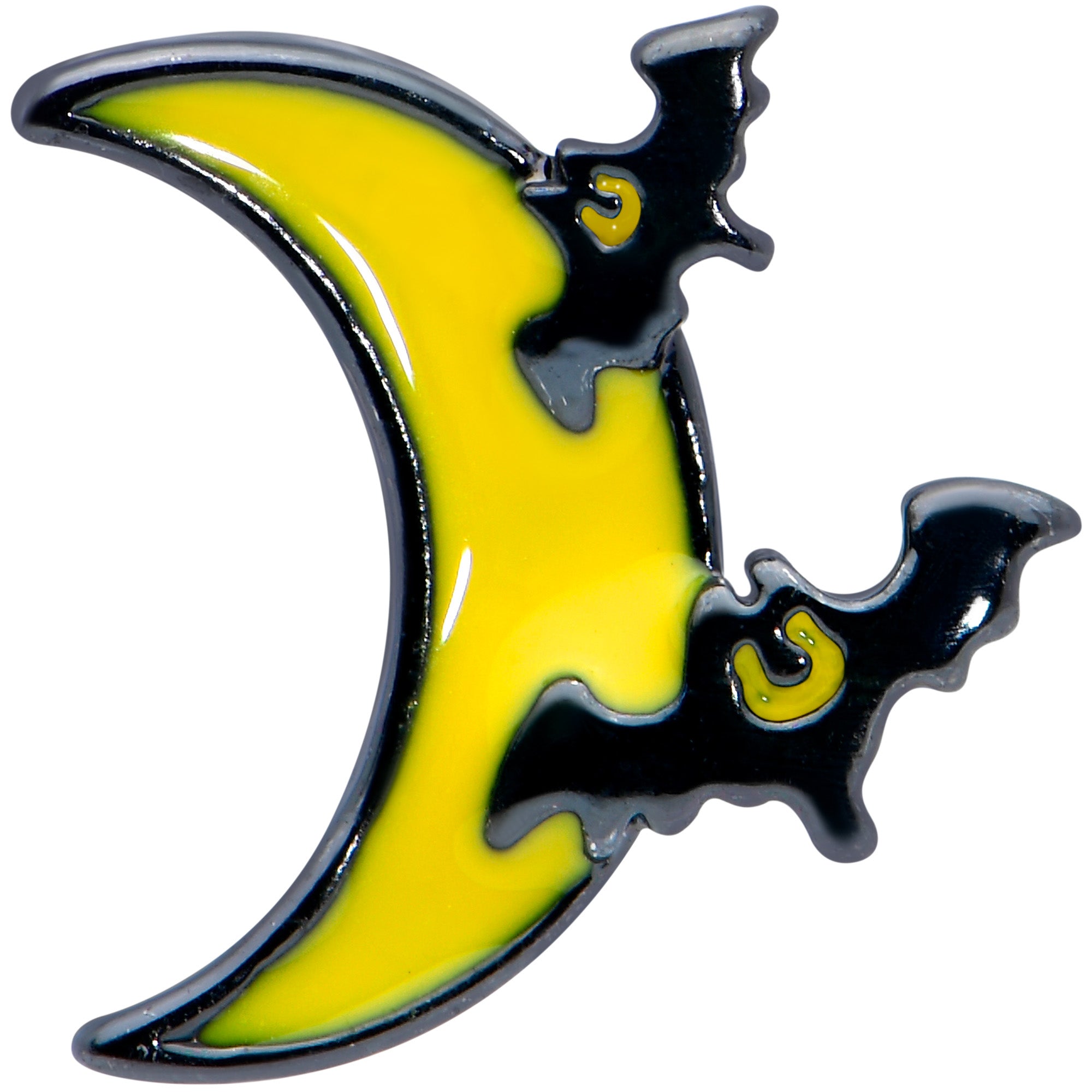 Instead of the man in the moon, the moon on this 16 gauge tragus jewelry has gone batty! It's made with a 6mm black plated over 316L surgical grade stainless steel straight barbell with a 4mm ball end. The front features a yellow inlaid crescent moon charm. It's embellished with a pair of black bats, winging their way across the sky for a truly creepy look! You can also boast these bats in multiple piercings including tragus, helix, and some conch piercings. Go bats for Halloween with this lovely, lunar cartilage stud!