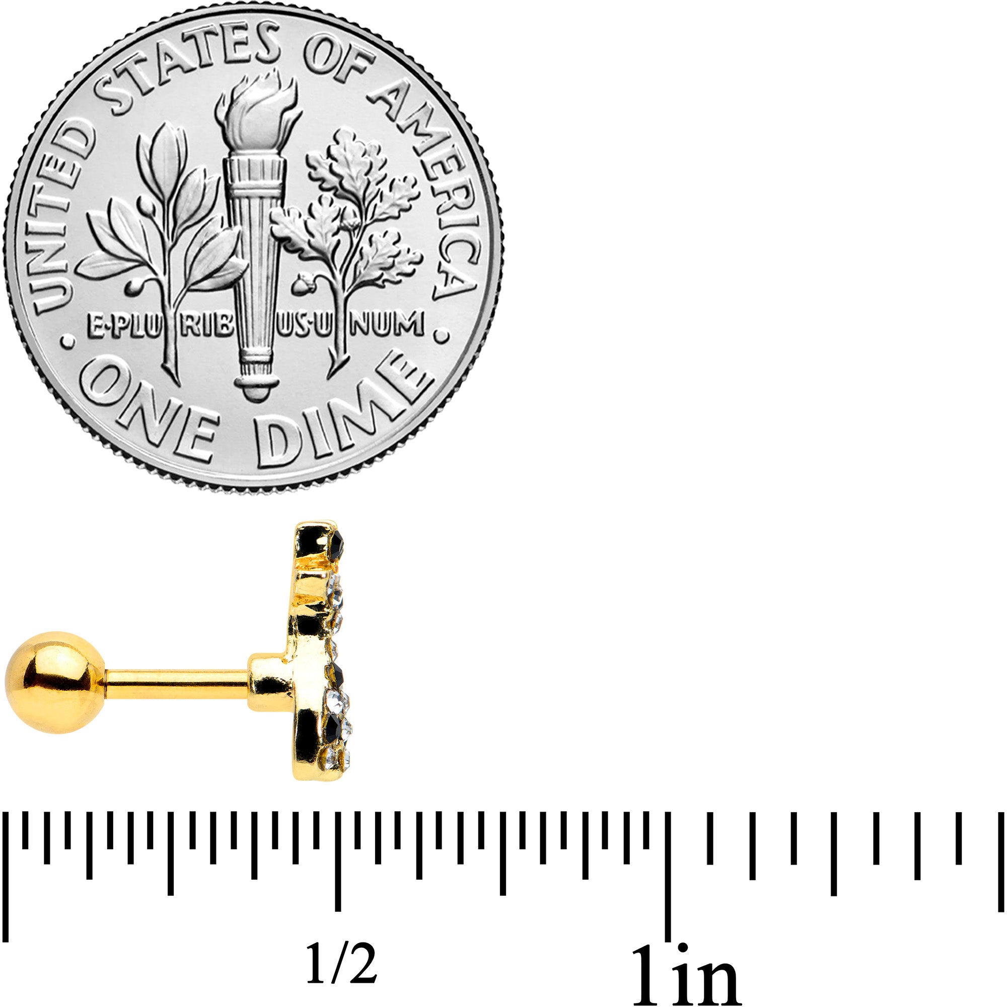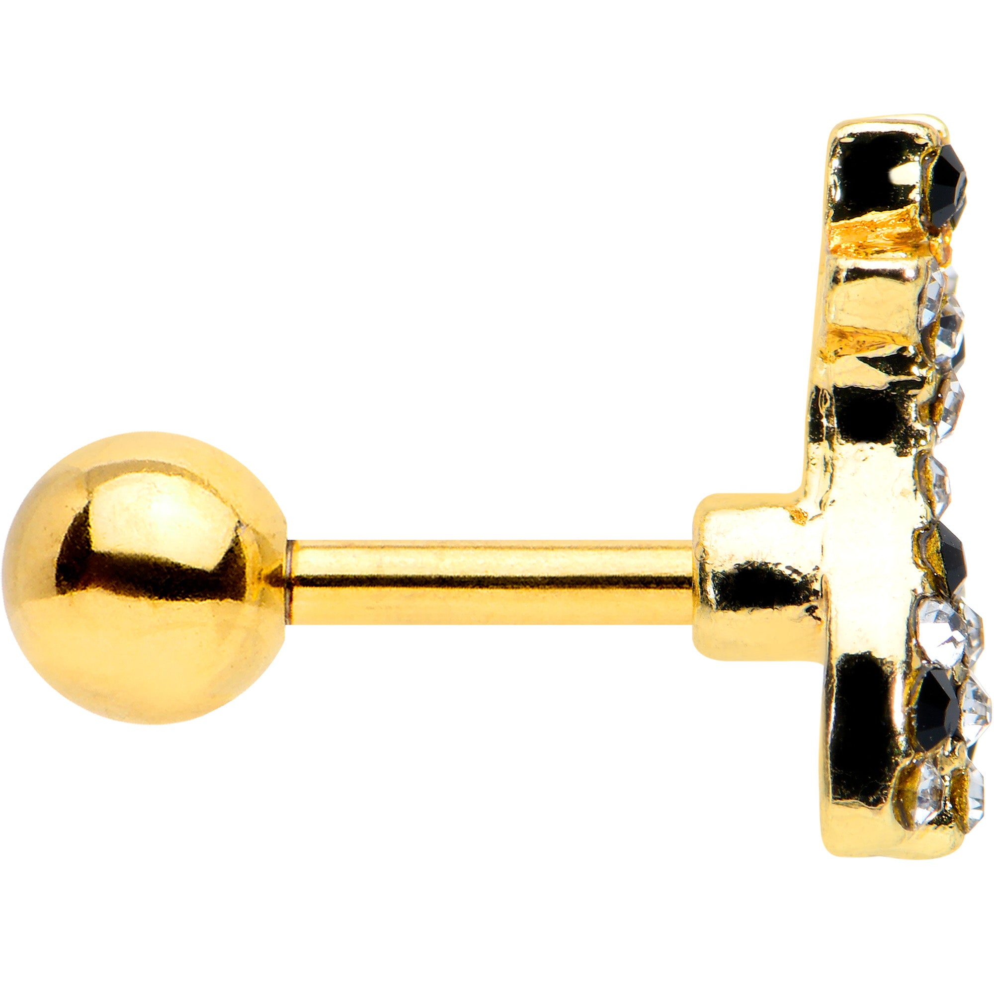 The deer on this 16 gauge tragus stud is all decked out and looking divine! It's made with a 6mm gold tone PVD over 316L surgical grade stainless steel straight barbell with a 4mm ball end. It features a deer charm, embellished with black and clear gems for some serious style. You can even rock this deer in multiple piercings including tragus, helix, and some conch piercings. Whether you're a deer devotee or a happy hunter, this is one doe that is sure to have you singing!