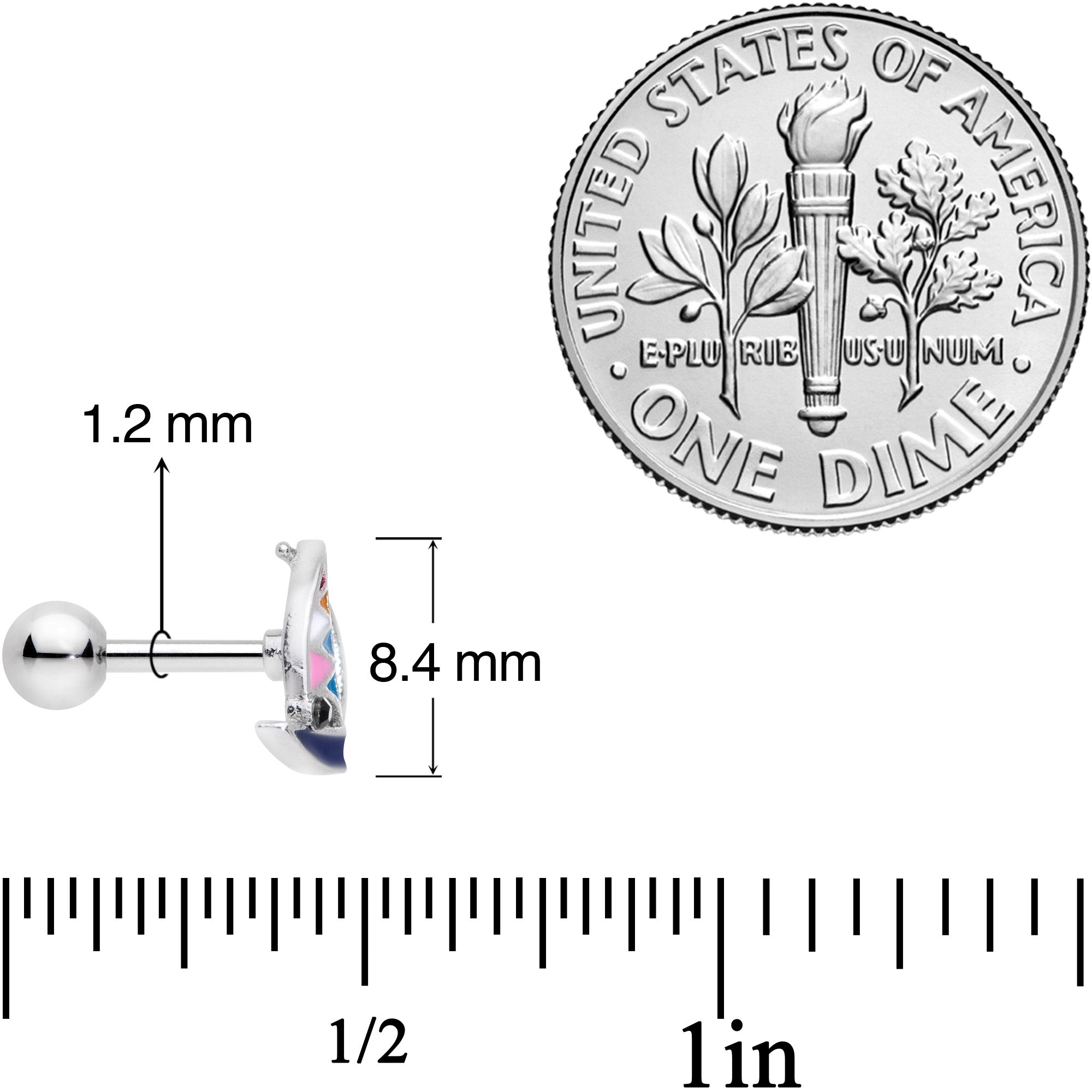 Sail the seas of style with this nautical 16 gauge cartilage stud! It's made with a 6mm durable 316L surgical grade stainless steel straight barbell with a 3mm ball end. It features a sailboat charm with the sail catching a good breeze. The boat is black with a white, teal, and pink sail and is embellished with a small black gem. It also works beautifully in multiple cartilage piercings including the tragus, helix, conch, and more. Lift the anchor and let your tragus piercing set sail for a land of summer luxury with this nifty nautical cartilage earring!
