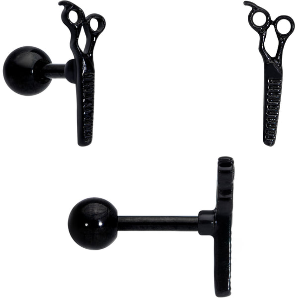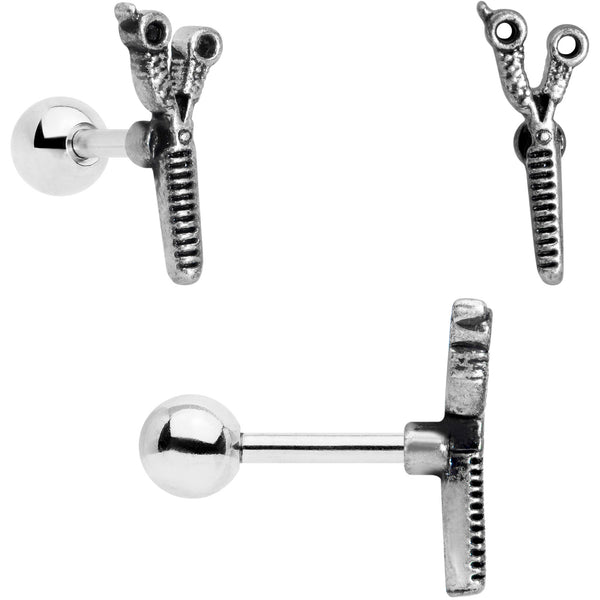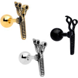 Whether you're a hairdresser or just love to style, this set of 16 gauge cartilage studs will tell the world! One is made with a 6mm black PVD over 316L surgical grade stainless steel straight barbell. The second is made with a 6mm gold tone PVD over 316L surgical grade stainless steel straight barbell. The third is made with a 6mm durable 316L surgical grade stainless steel straight barbell and all three have 4mm ball ends. Each features a simple pair of shears charm with textured detailing and look of antique-styled realism. You can rock these cartilage studs at the salon in multiple piercings including helix, tragus, and some conch piercings. If you're looking for new jewelry for your cartilage piercing, these tragus rings are sure to make the cut! Sold as a set of three.