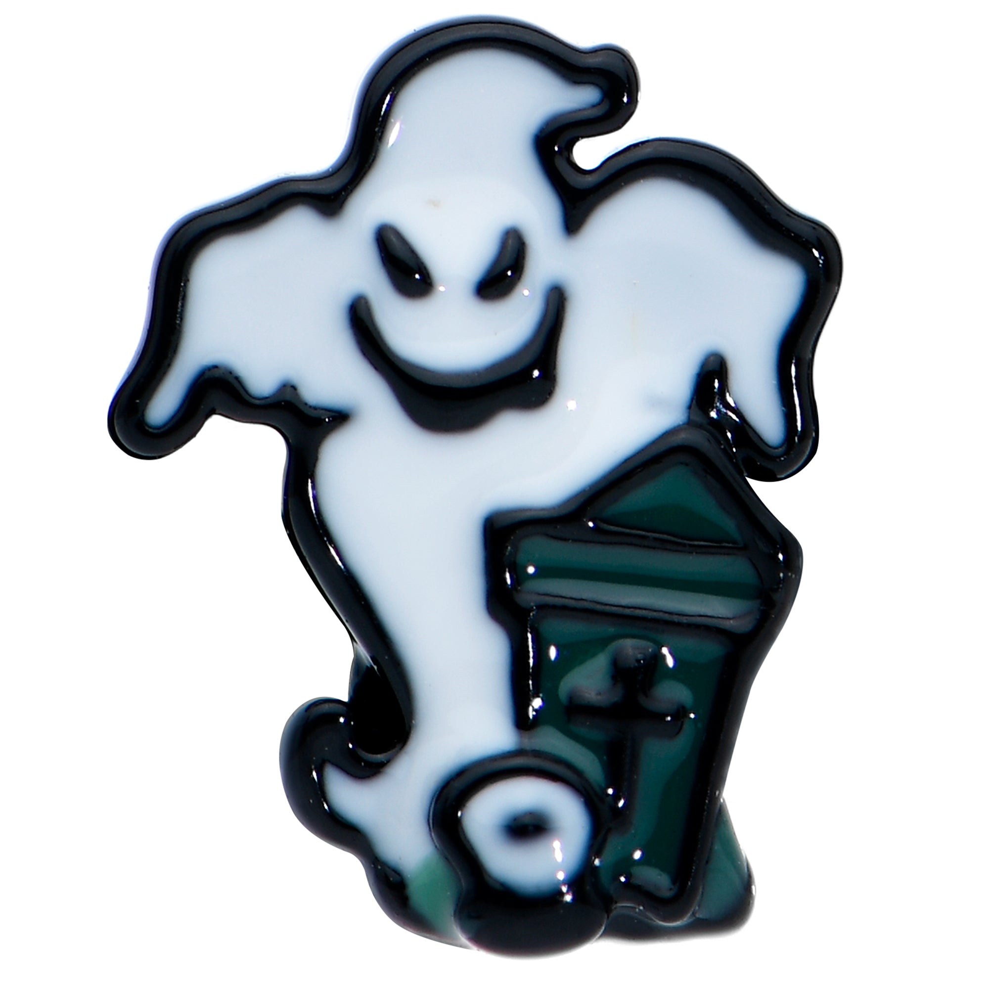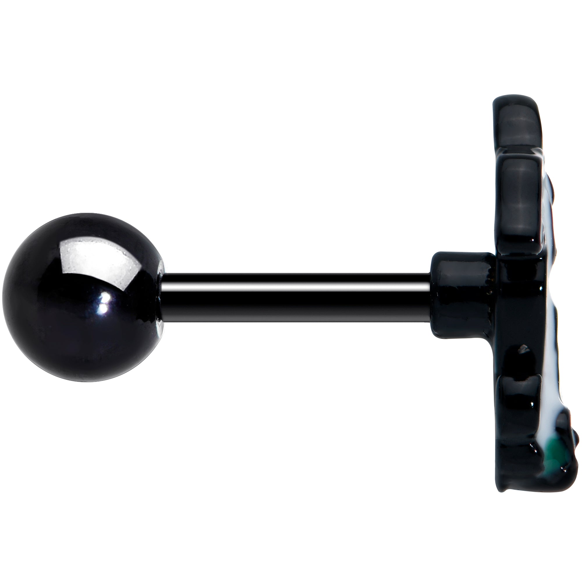 What better place for a ghost than a graveyard....or this 16 gauge tragus stud? It's made with a 6mm black plated over 316L surgical grade stainless steel straight barbell with a 4mm ball end. It features a white ghost charm with a wicked smile, lurking behind a dilapidated looking tombstone. In front of the ghost is a tiny Grim Reaper. You can rock this devious duo in multiple piercings including helix, tragus, and some conch piercings. This Halloween, grab some grim and gorgeous cartilage jewelry with this marvelously morbid cartilage stud!