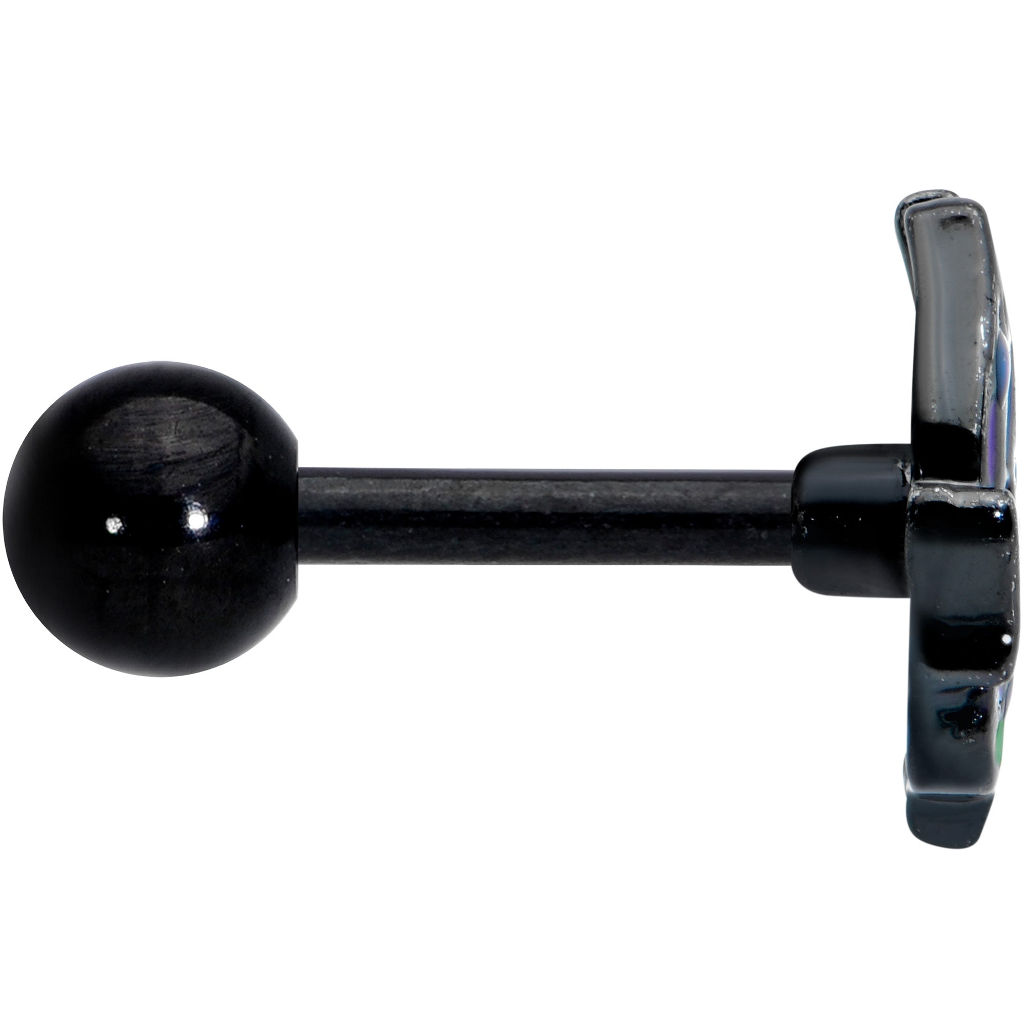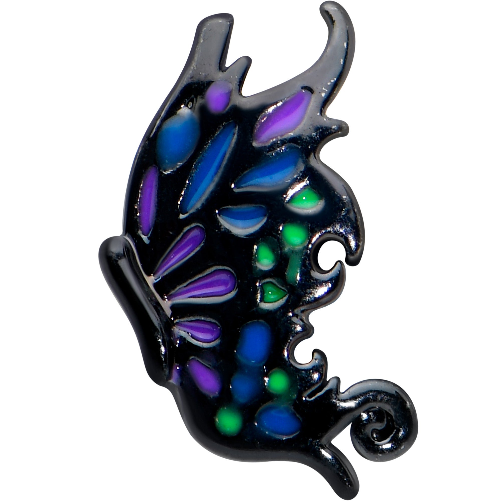 Let your cartilage piercings float like a butterfly with this 16 gauge tragus stud! It's made with a 6mm black PVD over 316L surgical grade stainless steel straight barbell with a 4mm ball end. It features a butterfly charm, with the butterfly in profile. The butterfly's wings are inlaid in purple and green for a gorgeous color combination that really packs a punch. You can even wear it in multiple piercings including helix, tragus, and some conch piercings. Add wings to your look with this beautiful butterfly cartilage jewelry!