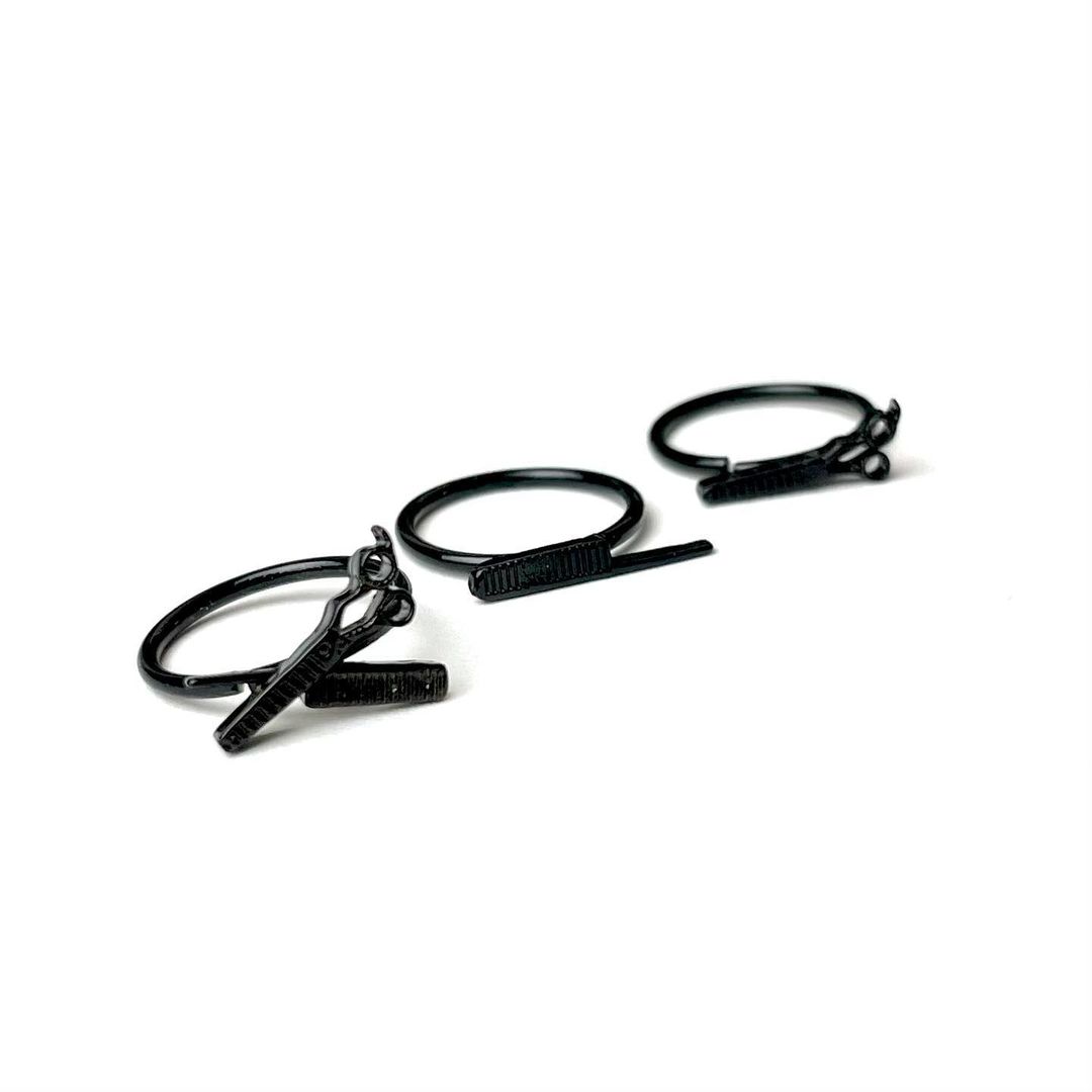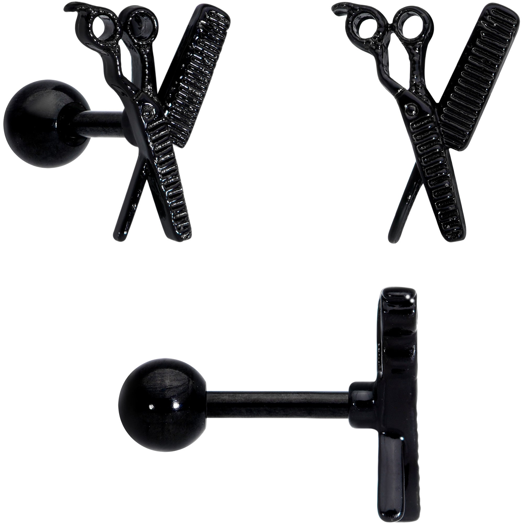 Whether you're a hairdresser or just love to style like you work in a salon, this set of 16 gauge cartilage studs will tell the world! They're made with 6mm black PVD over 316L surgical grade stainless steel straight barbells with 4mm ball ends. One features a rat-tail comb charm, with its unmistakable silhouette. The second features a simple pair of shears charm. And if you just can't choose, the third one features both, with a shears crossing comb charm for an added bit of style. And you can rock these tragus studs in multiple piercings including helix, tragus, and some conch piercings. If you're looking for new jewelry for your cartilage piercing, these tragus rings are sure to make the cut! Sold as a set of three.